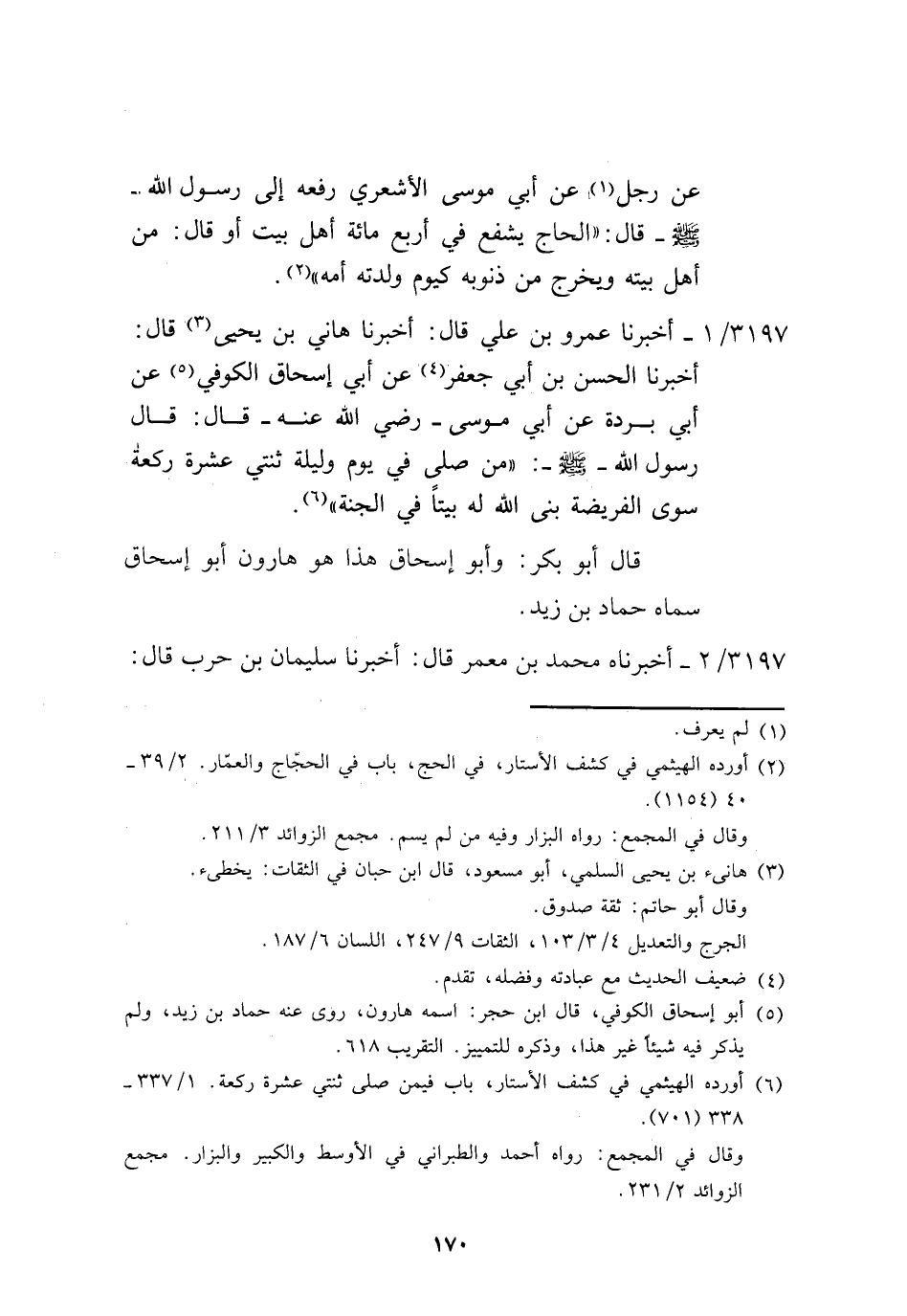 أَخْبَرَنَا عَمْرُو بْنُ عَلِيٍّ، قَالَ: أَخْبَرَنَا هَانِئُ بْنُ يَحْيَى، قَالَ: أَخْبَرَنَا الْحَسَنُ بْنُ أَبِي جَعْفَرٍ، عَنْ أَبِي إِسْحَاقَ الْكُوفِيِّ، عَنْ أَبِي بُرْدَةَ، عَنْ أَبِي مُوسَى، رَضِيَ اللَّهُ عَنْهُ قَالَ: قَالَ رَسُولُ اللَّهِ صَلَّى اللهُ عَلَيْهِ وَسَلَّمَ: «§مَنْ صَلَّى فِي يَوْمٍ وَلَيْلَةٍ اثْنَتَيْ عَشْرَةَ رَكْعَةً سِوَى الْفَرِيضَةِ بَنَى اللَّهُ لَهُ بَيْتًا فِي الْجَنَّةِ» ، قَالَ أَبُو بَكْرٍ: وَأَبُو إِسْحَاقَ هَذَا هُوَ هَارُونُ أَبُو إِسْحَاقَ، سَمَّاهُ حَمَّادُ بْنُ زَيْدٍ، أَخْبَرَنَاهُ مُحَمَّدُ بْنُ مَعْمَرٍ، قَالَ: أَخْبَرَنَا سُلَيْمَانُ بْنُ حَرْبٍ، قَالَ -[171]-: أَخْبَرَنَا حَمَّادُ بْنُ زَيْدٍ، قَالَ: أَخْبَرَنَا هَارُونُ أَبُو إِسْحَاقَ، عَنْ أَبِي بُرْدَةَ، عَنْ أَبِي مُوسَى، عَنِ النَّبِيِّ صَلَّى اللهُ عَلَيْهِ وَسَلَّمَ بِنَحْوِهِ، وَهَذَا الْحَدِيثُ لَا نَعْلَمُ رَوَاهُ عَنْ أَبِي بُرْدَةَ، عَنْ أَبِي مُوسَى، إِلَّا هَارُونُ وَلَا أَعْلَمُ تَابَعَ هَارُونُ عَلَى هَذَا الْحَدِيثِ أَحَدٌ وَلَا أَعْلَمُ رَوَى عَنْهُ إِلَّا هَذَانِ الرَّجُلَانِ