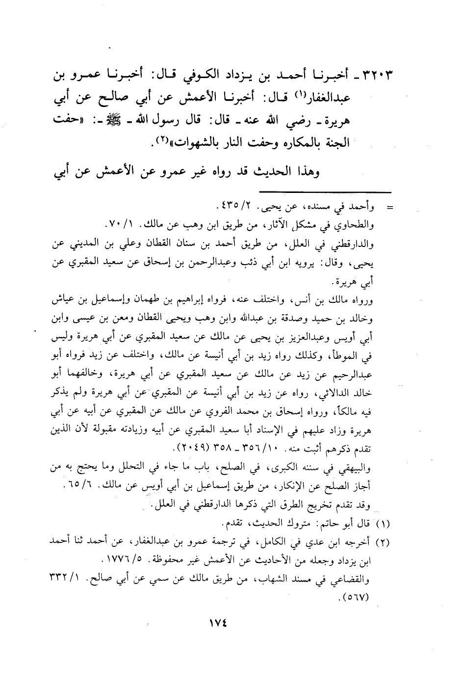 3203 - أَخْبَرَنَا أَحْمَدُ بْنُ يَزْدَادَ الْكُوفِيُّ، قَالَ: أَخْبَرَنَا عَمْرُو بْنُ عَبْدِ الْغَفَّارِ، قَالَ: أَخْبَرَنَا الْأَعْمَشُ، عَنْ أَبِي صَالِحٍ، عَنْ أَبِي هُرَيْرَةَ، رَضِيَ اللَّهُ عَنْهُ قَالَ: قَالَ رَسُولُ اللَّهِ صَلَّى اللهُ عَلَيْهِ وَسَلَّمَ: «§حُفَّتِ الْجَنَّةُ بِالْمَكَارِهِ، وَحُفَّتِ النَّارُ بِالشَّهَوَاتِ» ، وَهَذَا الْحَدِيثُ قَدْ رَوَاهُ غَيْرُ عَمْرٍو عَنِ الْأَعْمَشِ عَنْ أَبِي -[175]- صَالِحٍ مُرْسَلًا، وَرَوَاهُ حَمَّادُ بْنُ سَلَمَةَ عَنْ ثَابِتٍ عَنْ أَنَسٍ عَنِ النَّبِيِّ صَلَّى اللهُ عَلَيْهِ وَسَلَّمَ