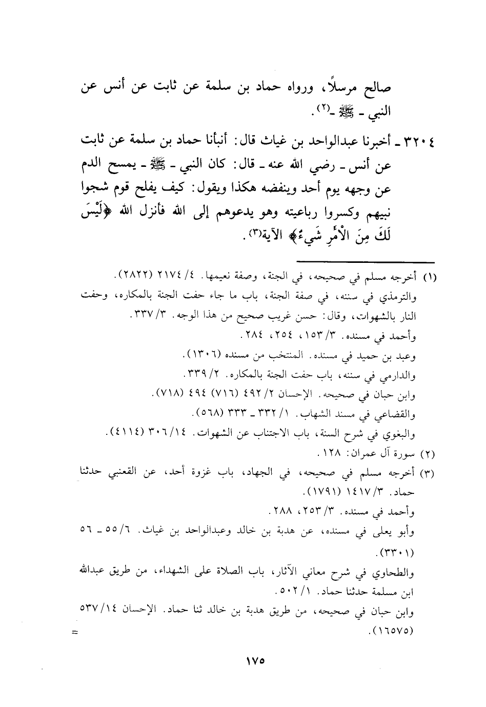 3204 - أَخْبَرَنَا عَبْدُ الْوَاحِدِ بْنُ غِيَاثٍ، قَالَ: أَنْبَأَنَا حَمَّادُ بْنُ سَلَمَةَ، عَنْ ثَابِتٍ، عَنْ أَنَسٍ، رَضِيَ اللَّهُ عَنْهُ قَالَ: كَانَ النَّبِيُّ صَلَّى اللهُ عَلَيْهِ وَسَلَّمَ يَمْسَحُ الدَّمَ عَنْ وَجْهِهِ يَوْمَ أُحُدٍ وَيَنْفُضُهُ هَكَذَا، وَيَقُولُ: «§كَيْفَ يُفْلِحُ قَوْمٌ شَجُّوا نَبِيَّهَمْ، وَكَسَرُوا رَبَاعِيَتُهُ، وَهُوَ يَدْعُوهُمْ إِلَى اللَّهِ» ، فَأَنْزَلَ اللَّهُ {لَيْسَ لَكَ مِنَ الْأَمْرِ شَيْءٌ} [آل عمران: 128] الْآيَةُ