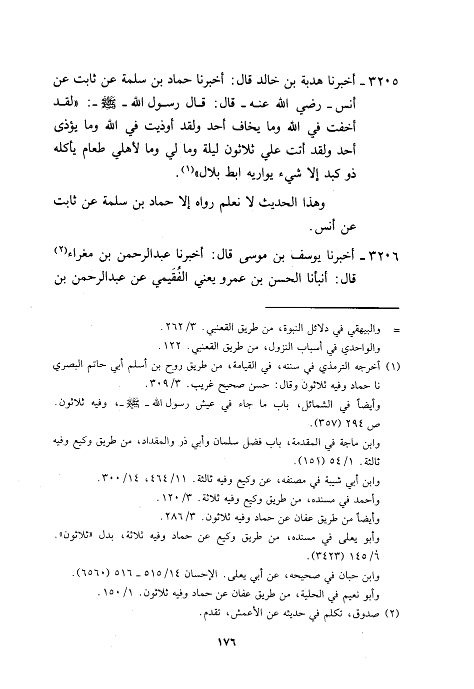 3205 - أَخْبَرَنَا هُدْبَةُ بْنُ خَالِدٍ، قَالَ: أَخْبَرَنَا حَمَّادُ بْنُ سَلَمَةَ، عَنْ ثَابِتٍ، عَنْ أَنَسٍ، رَضِيَ اللَّهُ عَنْهُ قَالَ: قَالَ رَسُولُ اللَّهِ صَلَّى اللهُ عَلَيْهِ وَسَلَّمَ: «لَقَدْ §أُخِفْتُ فِي اللَّهِ وَمَا يَخَافُ أَحَدٌ، وَلَقَدْ أُوذِيتُ فِي اللَّهِ وَمَا يُؤْذَى أَحَدٌ، وَلَقَدْ أَتَتْ عَلَيَّ ثَلَاثُونَ لَيْلَةً وَمَا لِي وَمَا لِأَهْلِي طَعَامٌ يَأْكُلُهُ ذُو كَبِدٍ إِلَّا شَيْءٌ يُوَارِيهِ إِبِطُ بِلَالٍ» ، وَهَذَا الْحَدِيثُ لَا نَعْلَمُ رَوَاهُ إِلَّا حَمَّادُ بْنُ سَلَمَةَ عَنْ ثَابِتٍ عَنْ أَنَسٍ