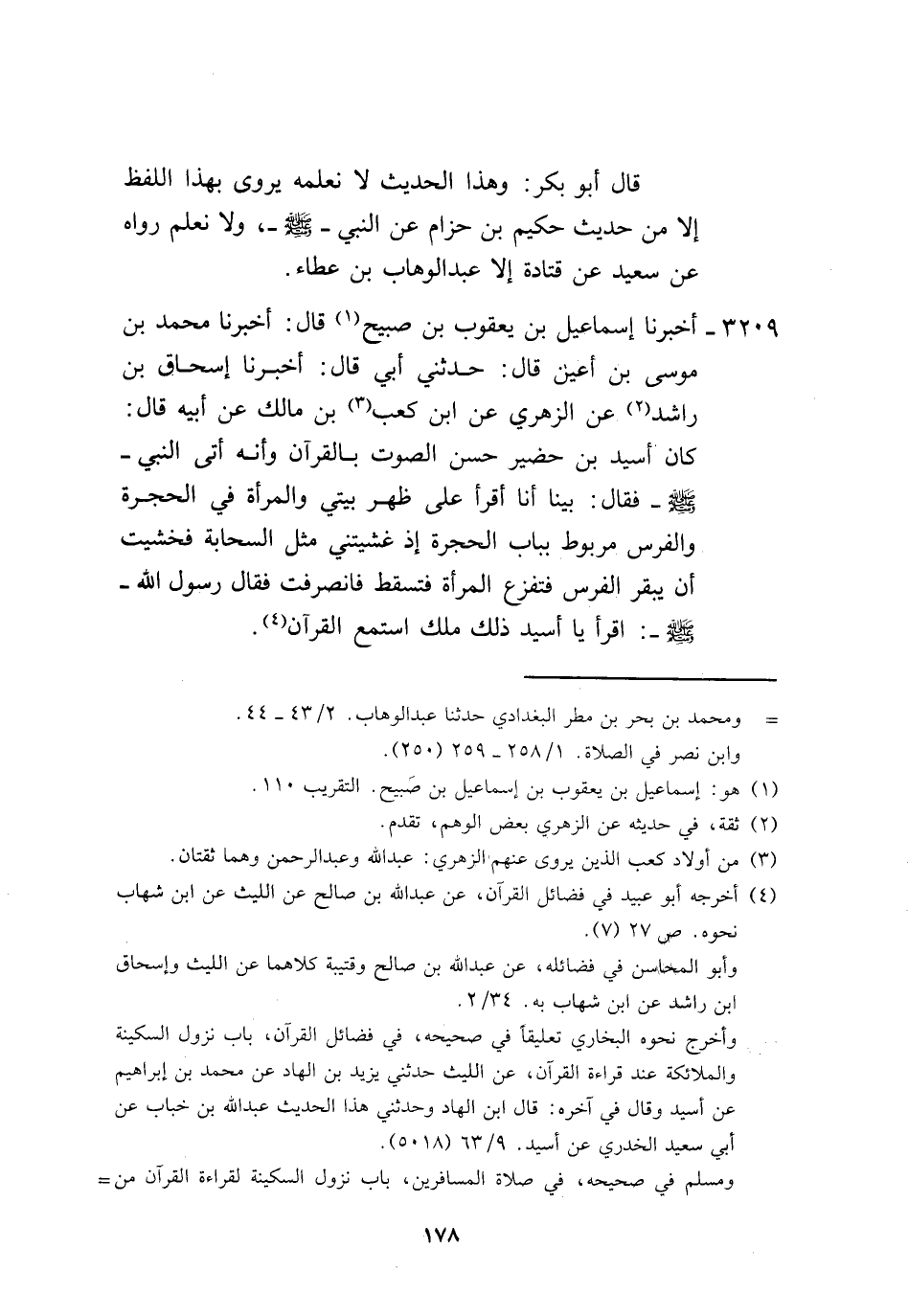 3209 - أَخْبَرَنَا إِسْمَاعِيلُ بْنُ يَعْقُوبَ بْنِ صُبَيْحٍ، قَالَ: أَخْبَرَنَا مُحَمَّدُ بْنُ مُوسَى بْنِ أَعْيَنَ، قَالَ: حَدَّثَنِي أَبِي، قَالَ: أَخْبَرَنَا إِسْحَاقُ بْنُ رَاشِدٍ، عَنِ الزُّهْرِيِّ، عَنِ ابْنِ كَعْبِ بْنِ مَالِكٍ، عَنْ أَبِيهِ، قَالَ: كَانَ أُسَيْدُ بْنُ حُضَيْرٍ حَسَنَ الصَّوْتِ بِالْقُرْآنِ، وَأَنَّهُ أَتَى النَّبِيَّ صَلَّى اللهُ عَلَيْهِ وَسَلَّمَ فَقَالَ: بَيْنَا أَنَا أَقْرَأُ عَلَى ظَهْرِ بَيْتِي، وَالْمَرْأَةُ فِي الْحُجْرَةِ، وَالْفَرَسُ مَرْبُوطٌ بِبَابِ الْحُجْرَةِ، إِذْ غَشِيَتْنِي مِثْلُ السَّحَابَةِ، فَخَشِيتُ أَنْ يَبْقَرَ الْفَرَسُ فَتَفْزَعَ الْمَرْأَةُ فَتَسْقُطَ فَانْصَرَفْتُ، فَقَالَ رَسُولُ اللَّهِ صَلَّى اللهُ عَلَيْهِ وَسَلَّمَ: «§اقْرَأْ يَا أُسَيْدُ ذَلِكَ مَلَكٌ اسْتَمَعَ الْقُرْآنَ» -[179]- وَهَذَا الْحَدِيثُ لَا نَعْلَمُهُ يُرْوَى عَنِ ابْنِ كَعْبِ بْنِ مَالِكٍ عَنْ أَبِيهِ إِلَّا بِهَذَا الْإِسْنَادِ