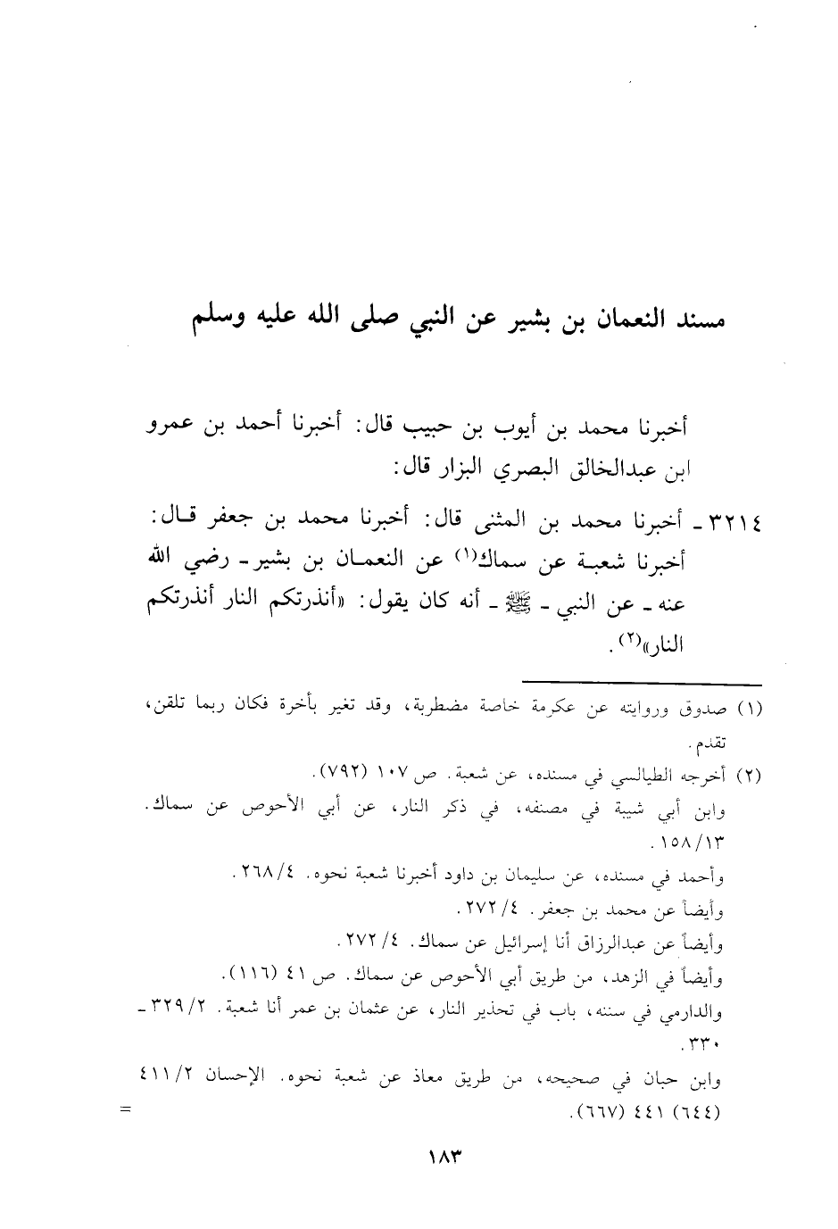 3214 - أَخْبَرَنَا مُحَمَّدُ بْنُ الْمُثَنَّى، قَالَ: أَخْبَرَنَا مُحَمَّدُ بْنُ جَعْفَرٍ، قَالَ: أَخْبَرَنَا شُعْبَةُ، عَنْ سِمَاكٍ، عَنِ النُّعْمَانِ بْنِ بَشِيرٍ، رَضِيَ اللَّهُ عَنْهُ عَنِ النَّبِيِّ صَلَّى اللهُ عَلَيْهِ وَسَلَّمَ أَنَّهُ كَانَ يَقُولُ: «§أَنْذَرْتُكُمُ النَّارَ، أَنْذَرْتُكُمُ النَّارَ» -[184]-، وَهَذَا الْحَدِيثُ لَا نَعْلَمُهُ يُرْوَى بِهَذَا اللَّفْظِ إِلَّا عَنِ النُّعْمَانِ بْنِ بَشِيرٍ عَنِ النَّبِيِّ صَلَّى اللهُ عَلَيْهِ وَسَلَّمَ