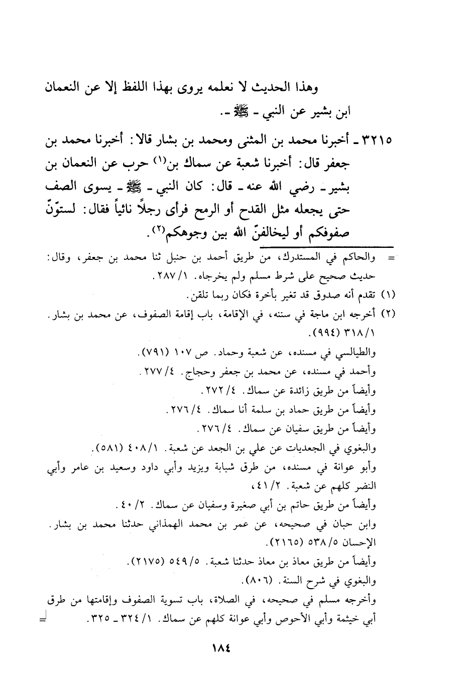 3215 - أَخْبَرَنَا مُحَمَّدُ بْنُ الْمُثَنَّى، وَمُحَمَّدُ بْنُ بَشَّارٍ، قَالَا: أَخْبَرَنَا مُحَمَّدُ بْنُ جَعْفَرٍ، قَالَ: أَخْبَرَنَا شُعْبَةُ، عَنْ سِمَاكِ بْنِ حَرْبٍ، عَنِ النُّعْمَانِ بْنِ بَشِيرٍ، رَضِيَ اللَّهُ عَنْهُ قَالَ: كَانَ النَّبِيُّ صَلَّى اللهُ عَلَيْهِ وَسَلَّمَ يُسَوِّي الصَّفَّ، حَتَّى يَجْعَلَهُ مِثْلَ الْقَدَحِ أَوِ الرُّمْحِ، فَرَأَى رَجُلًا نَائِيًا، فَقَالَ: «§لَتُسَوُّنَّ صُفُوفَكُمْ أَوْ لَيُخَالِفَنَّ اللَّهُ بَيْنَ وُجُوهِكُمْ»