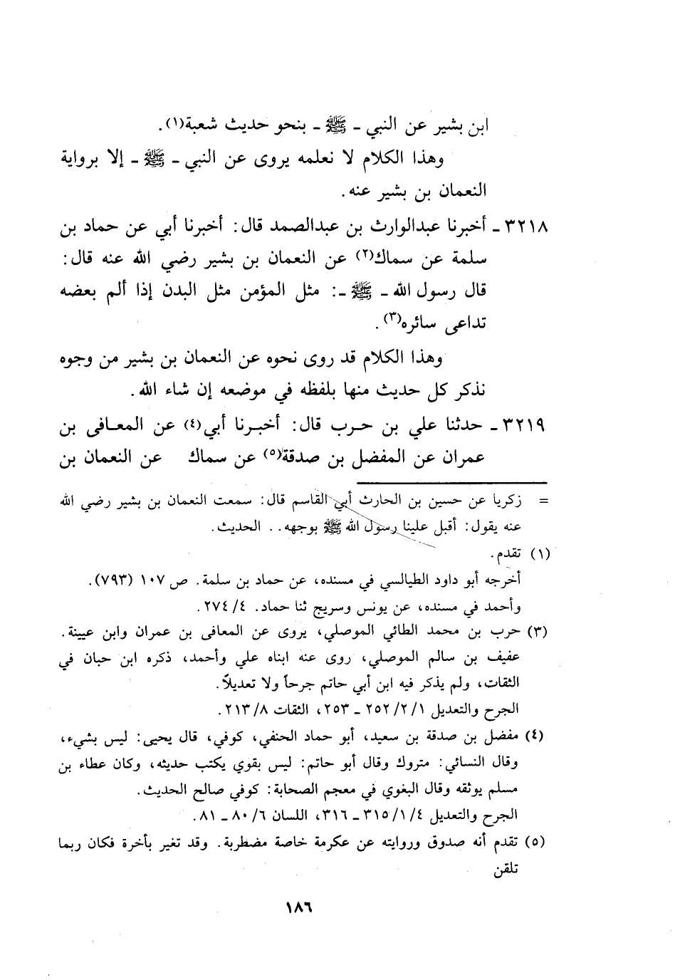 3218 - أَخْبَرَنَا عَبْدُ الْوَارِثِ بْنُ عَبْدِ الصَّمَدِ، قَالَ: أَخْبَرَنَا أَبِي، عَنْ حَمَّادِ بْنِ سَلَمَةَ، عَنْ سِمَاكٍ، عَنِ النُّعْمَانِ بْنِ بَشِيرٍ رَضِيَ اللَّهُ عَنْهُ قَالَ: قَالَ رَسُولُ اللَّهِ صَلَّى اللهُ عَلَيْهِ وَسَلَّمَ: «§مَثَلُ الْمُؤْمِنِ مَثَلُ الْبَدَنِ، إِذَا أَلِمَ بَعْضُهُ تَدَاعَى سَائِرُهُ» ، وَهَذَا الْكَلَامُ قَدْ رُوِيَ نَحْوُهُ عَنِ النُّعْمَانِ بْنِ بَشِيرٍ مِنْ وُجُوهٍ نَذْكُرُ كُلَّ حَدِيثٍ مِنْهَا بِلَفْظِهِ فِي مَوْضِعِهِ إِنْ شَاءَ اللَّهُ