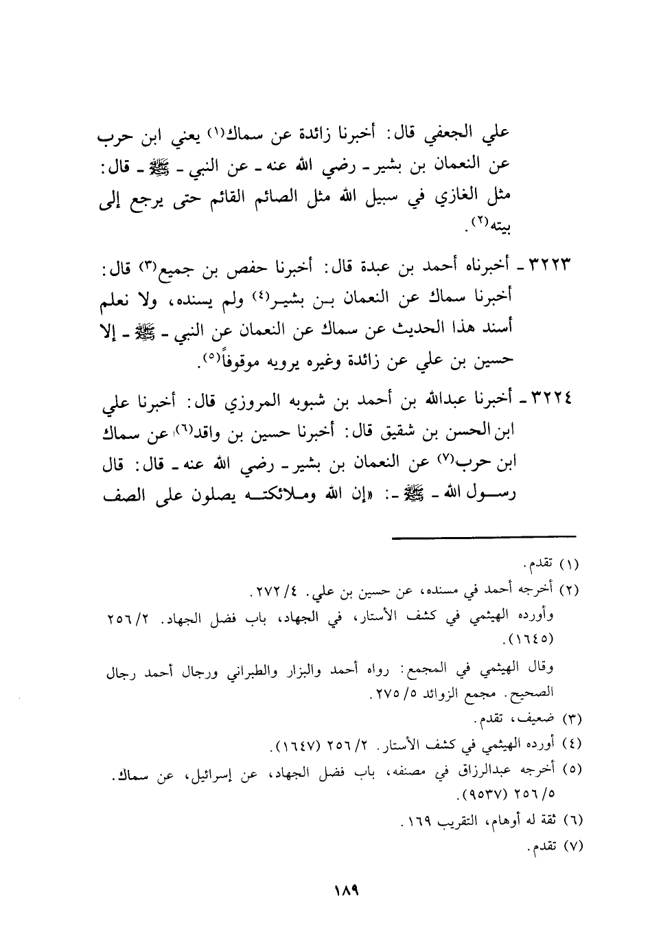 3224 - أَخْبَرَنَا عَبْدُ اللَّهِ بْنُ أَحْمَدَ بْنِ شَبُوبَةَ الْمَرْوَزِيُّ، قَالَ: أَخْبَرَنَا عَلِيُّ بْنُ الْحَسَنِ بْنِ شَقِيقٍ، قَالَ: أَخْبَرَنَا حُسَيْنُ بْنُ وَاقِدٍ، عَنْ سِمَاكِ بْنِ حَرْبٍ، عَنِ النُّعْمَانِ بْنِ بَشِيرٍ، رَضِيَ اللَّهُ عَنْهُ قَالَ: قَالَ رَسُولُ اللَّهِ صَلَّى اللهُ عَلَيْهِ وَسَلَّمَ: «إِنَّ §اللَّهَ وَمَلَائِكَتَهُ يُصَلُّونَ عَلَى الصَّفِّ -[190]- الْأَوَّلِ» ، وَهَذَا الْحَدِيثُ لَا نَعْلَمُ أَحَدًا رَوَاهُ عَنْ سِمَاكٍ عَنِ النُّعْمَانِ إِلَّا حُسَيْنُ بْنُ وَاقِدٍ