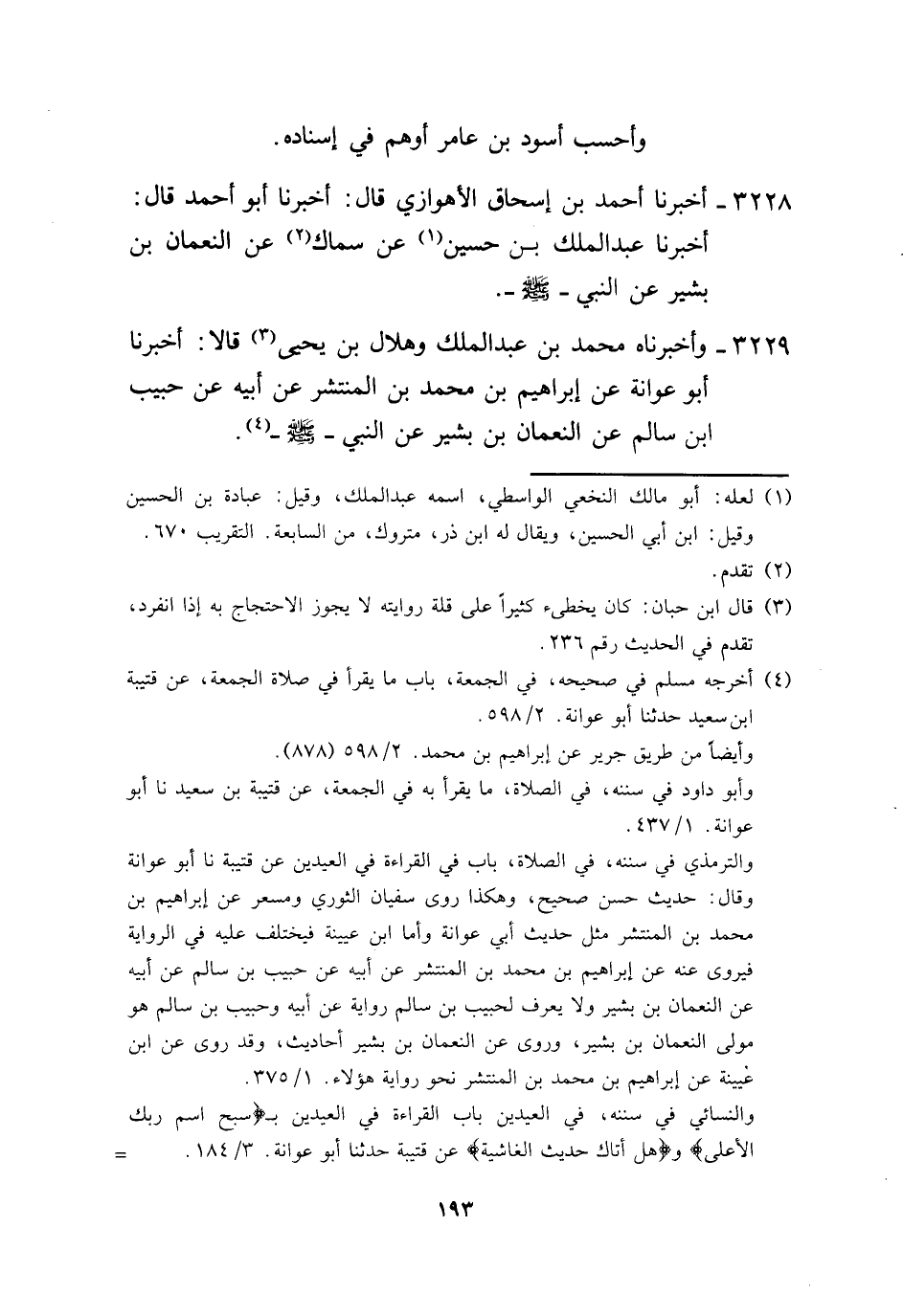 3229 - وَأَخْبَرَنَاهُ مُحَمَّدُ بْنُ عَبْدِ الْمَلِكِ، وَهِلَالُ بْنُ يَحْيَى، قَالَا: أَخْبَرَنَا أَبُو عَوَانَةَ، عَنْ إِبْرَاهِيمَ بْنِ مُحَمَّدِ بْنِ الْمُنْتَشِرِ، عَنْ أَبِيهِ، عَنْ حَبِيبِ بْنِ سَالِمٍ، عَنِ النُّعْمَانِ بْنِ بَشِيرٍ، عَنِ النَّبِيِّ صَلَّى اللهُ عَلَيْهِ وَسَلَّمَ -[194]-،