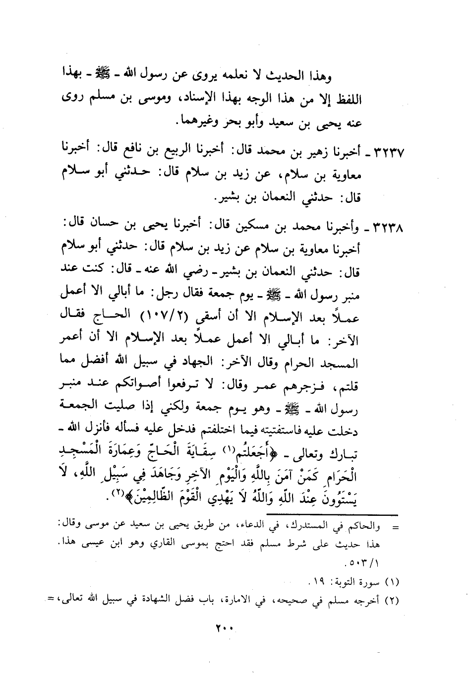 3238 - وَأَخْبَرَنَا مُحَمَّدُ بْنُ مِسْكِينٍ، قَالَ: أَخْبَرَنَا يَحْيَى بْنُ حَسَّانَ، قَالَ: أَخْبَرَنَا مُعَاوِيَةُ بْنُ سَلَّامٍ، عَنْ زَيْدِ بْنِ سَلَّامٍ، قَالَ: حَدَّثَنِي أَبُو سَلَّامٍ، قَالَ: حَدَّثَنِي النُّعْمَانُ بْنُ بَشِيرٍ رَضِيَ اللَّهُ عَنْهُ قَالَ: " كُنْتُ عِنْدَ مِنْبَرِ رَسُولِ اللَّهِ صَلَّى اللهُ عَلَيْهِ وَسَلَّمَ يَوْمَ جُمُعَةٍ، فَقَالَ رَجُلٌ: مَا أُبَالِي أَلَّا أَعْمَلَ عَمَلًا بَعْدَ الْإِسْلَامِ إِلَّا أَنْ أَسْقِيَ الْحَاجَّ، فَقَالَ الْآخَرُ: مَا أُبَالِي أَلَّا أَعْمَلَ عَمَلًا بَعْدَ الْإِسْلَامِ إِلَّا أَنْ أَعْمُرَ الْمَسْجِدَ الْحَرَامَ، وَقَالَ الْآخَرُ: الْجِهَادُ فِي سَبِيلِ اللَّهِ أَفْضَلُ مِمَّا قُلْتُمْ، فَزَجَرَهُمْ عُمَرُ وَقَالَ: " لَا تَرْفَعُوا أَصْوَاتَكُمْ عِنْدَ مِنْبَرِ رَسُولِ اللَّهِ صَلَّى اللهُ عَلَيْهِ وَسَلَّمَ وَهُوَ يَوْمُ جُمُعَةٍ، وَلَكِنِّي إِذَا صَلَّيْتُ الْجُمُعَةَ دَخَلْتُ عَلَيْهِ فَاسْتَفْتَيْتُهُ فِيمَا اخْتَلَفْتُمْ، فَدَخَلَ عَلَيْهِ فَسَأَلَهُ، §فَأَنْزَلَ اللَّهُ تَبَارَكَ وَتَعَالَى {أَجَعَلْتُمْ سِقَايَةَ الْحَاجِّ وَعِمَارَةَ الْمَسْجِدِ الْحَرَامِ كَمَنْ آمَنَ بِاللَّهِ وَالْيَوْمِ الْآخِرِ وَجَاهَدَ فِي سَبِيلِ اللَّهِ لَا يَسْتَوُونَ عِنْدَ اللَّهِ وَاللَّهُ لَا يَهْدِي الْقَوْمَ الظَّالِمِينَ} [التوبة: 19]