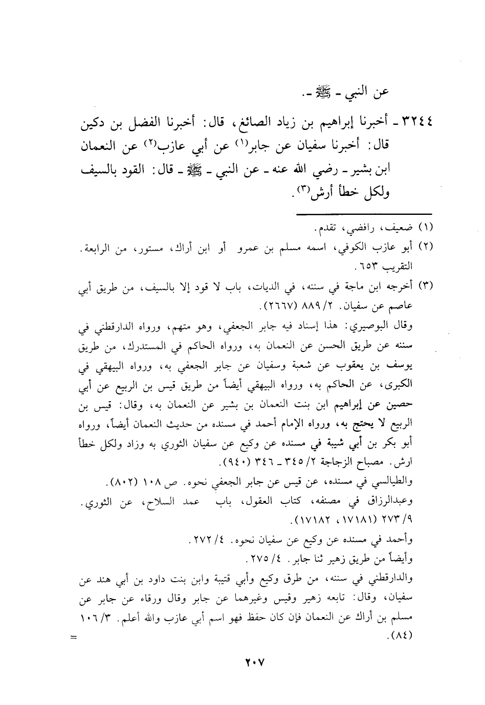 3244 - أَخْبَرَنَا إِبْرَاهِيمُ بْنُ زِيَادٍ الصَّائِغُ، قَالَ: أَخْبَرَنَا الْفَضْلُ بْنُ دُكَيْنٍ، قَالَ: أَخْبَرَنَا سُفْيَانُ، عَنْ جَابِرٍ، عَنْ أَبِي عَازِبٍ، عَنِ النُّعْمَانِ بْنِ بَشِيرٍ، رَضِيَ اللَّهُ عَنْهُ عَنِ النَّبِيِّ صَلَّى اللهُ عَلَيْهِ وَسَلَّمَ قَالَ: «§الْقَوَدُ بِالسَّيْفِ وَلِكُلِّ خَطَأٍ أَرْشٌ» -[208]- وَهَذَا الْحَدِيثُ لَا نَعْلَمُهُ يُرْوَى إِلَّا عَنِ النُّعْمَانِ بْنِ بَشِيرٍ، وَلَا نَعْلَمُ رَوَاهُ عَنِ النُّعْمَانِ إِلَّا أَبُو عَازِبٍ، وَلَا نَعْلَمُ رَوَاهُ عَنْ أَبِي عَازِبٍ، إِلَّا جَابِرٌ الْجُعْفِيُّ