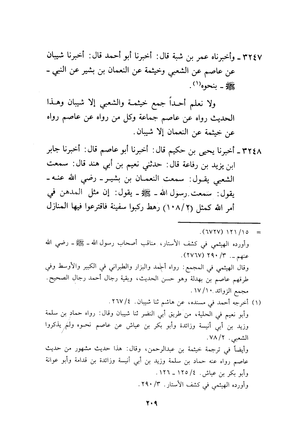 3248 - أَخْبَرَنَا يَحْيَى بْنُ حَكِيمٍ، قَالَ: أَخْبَرَنَا أَبُو عَاصِمٍ، قَالَ: أَخْبَرَنَا جَابِرُ بْنُ يَزِيدَ بْنِ رِفَاعَةَ، قَالَ: حَدَّثَنِي نُعَيْمُ بْنُ أَبِي هِنْدٍ، قَالَ: سَمِعْتُ الشَّعْبِيَّ، يَقُولُ: سَمِعْتُ النُّعْمَانَ بْنَ بَشِيرٍ، رَضِيَ اللَّهُ عَنْهُ يَقُولُ: سَمِعْتُ رَسُولَ اللَّهِ صَلَّى اللهُ عَلَيْهِ وَسَلَّمَ يَقُولُ: " إِنَّ §مَثَلَ الْمُدَّهِنِ فِي أَمْرِ اللَّهِ كَمَثَلِ رَهْطٍ رَكِبُوا سَفِينَةً فَاقْتَرَعُوا فِيهَا الْمَنَازِلَ -[210]-، فَأَصَابَ بَعْضُهُمْ أَسْفَلَهَا، وَأَصَابَ بَعْضُهُمْ أَعْلَاهَا، فَأَرَادَ رَجُلٌ مِمَّنْ هُوَ فِي أَسْفَلِهَا أَنْ يَخْرِقَهَا، فَقَالَ بَعْضُ مَنْ فِي أَعْلَاهَا: مَا تَصْنَعُ؟، قَالَ: أَخْرِقُهَا فَأَسْتَقِي مِنْهَا فَيَكُونُ أَهْوَنُ عَلَيَّ مِنْ أَنْ أَصْعَدَ إِلَيْكُمْ "، قَالَ رَسُولُ اللَّهِ صَلَّى اللهُ عَلَيْهِ وَسَلَّمَ: «فَإِنْ تَرَكُوهُ غَرِقَ وَغَرَّقَهُمْ، وَإِنْ مَنَعُوهُ نَجَا بِإِذْنِ اللَّهِ وَنَجَوْا» ،
