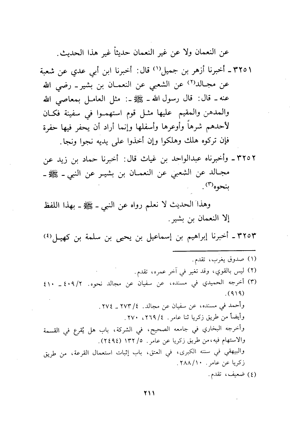 3251 - أَخْبَرَنَا أَزْهَرُ بْنُ جَمِيلٍ، قَالَ: أَخْبَرَنَا ابْنُ أَبِي عَدِيٍّ، عَنْ شُعْبَةَ، عَنْ مُجَالِدٍ، عَنِ الشَّعْبِيِّ، عَنِ النُّعْمَانِ بْنِ بَشِيرٍ، رَضِيَ اللَّهُ عَنْهُ قَالَ: قَالَ رَسُولُ اللَّهِ صَلَّى اللهُ عَلَيْهِ وَسَلَّمَ: «§مَثَلُ الْعَامِلِ بِمَعاصِي اللَّهِ وَالْمُدْهِنِ وَالْمُقِيمِ عَلَيْهَا، مَثَلُ قَوْمٍ اسْتَهَمُوا فِي سَفِينَةٍ فَكَانَ لِأَحَدِهِمْ شَرَّهَا وَأَوْعَرَهَا وَأَسْفَلَهَا، وَإِنَّمَا أَرَادَ أَنْ يَحْفِرَ فِيهَا حُفْرَةً، فَإِنْ تَرَكُوهُ هَلَكَ وَهَلَكُوا وَإِنْ أَخَذُوا عَلَى يَدَيْهِ نَجَوْا وَنَجَا» ،