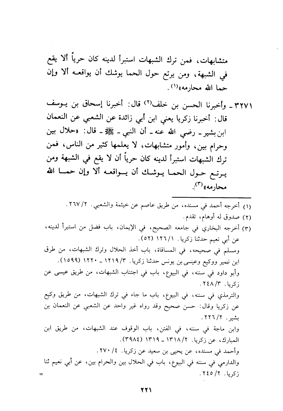 3271 - وَأَخْبَرَنَا الْحَسَنُ بْنُ خَلَفٍ، قَالَ: أَخْبَرَنَا إِسْحَاقُ بْنُ يُوسُفَ، قَالَ: أَخْبَرَنَا زَكَرِيَّا يَعْنِي ابْنَ أَبِي زَائِدَةَ، عَنِ الشَّعْبِيِّ، عَنِ النُّعْمَانِ بْنِ بَشِيرٍ، رَضِيَ اللَّهُ عَنْهُ أَنَّ النَّبِيَّ صَلَّى اللهُ عَلَيْهِ وَسَلَّمَ قَالَ: «§حَلَالٌ بَيِّنٌ وَحَرَامٌ بَيِّنٌ وَأُمُورٌ مُتَشَابِهَاتٌ لَا يَعْلَمُهَا كَثِيرٌ مِنَ النَّاسِ، فَمَنْ تَرَكَ الشُّبُهَاتِ اسْتَبْرَأَ لِدِينِهِ كَانَ حَرِيًّا أَنْ لَا يَقَعَ فِي الشُّبْهَةِ، وَمَنْ يَرْتَعْ حَوْلَ الْحِمَا يُوشِكُ أَنْ يُوَاقِعَهُ، أَلَا وَإِنَّ حِمَا اللَّهِ مَحَارِمُهُ»