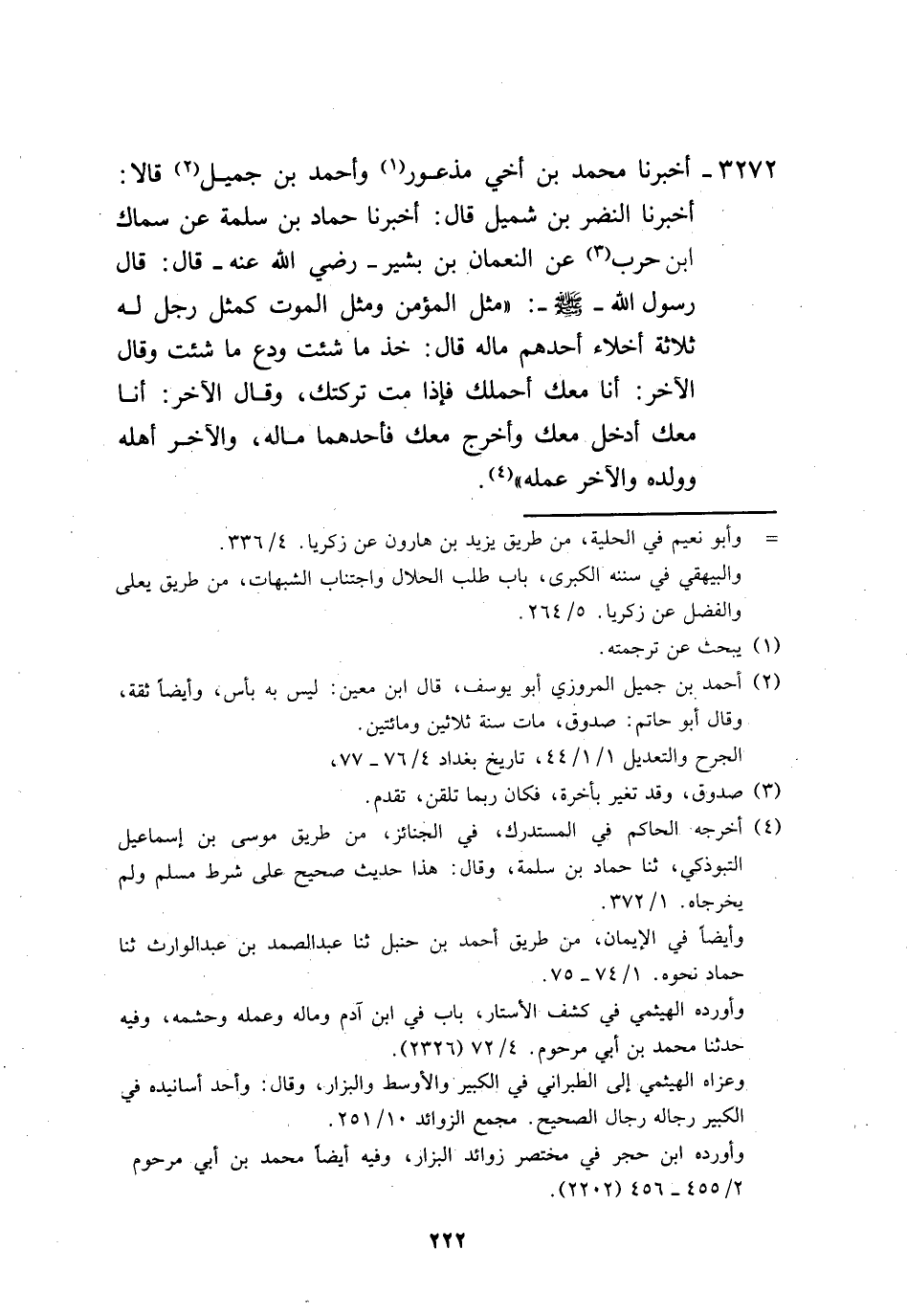 3272 - أَخْبَرَنَا مُحَمَّدُ ابْنُ أَخِي مَذْعُورٌ وَأَحْمَدُ بْنُ جَمِيلٍ، قَالَا: أَخْبَرَنَا النَّضْرُ بْنُ شُمَيْلِ، قَالَ: أَخْبَرَنَا حَمَّادُ بْنُ سَلَمَةَ، عَنْ سِمَاكِ بْنِ حَرْبٍ، عَنِ النُّعْمَانِ بْنِ بَشِيرٍ، رَضِيَ اللَّهُ عَنْهُ قَالَ: قَالَ رَسُولُ اللَّهِ صَلَّى اللهُ عَلَيْهِ وَسَلَّمَ: " §مَثَلُ الْمُؤْمِنِ وَمَثَلُ الْمَوْتِ كَمَثَلِ رَجُلٍ لَهُ ثَلَاثَةُ أَخِلَّاءَ، أَحَدُهُمْ مَالُهُ قَالَ: خُذْ مَا شِئْتَ وَدَعْ مَا شِئْتَ، وَقَالَ الْآخَرُ: أَنَا مَعَكَ أَحْمِلُكَ، فَإِذَا مُتَّ تَرَكْتُكَ، وَقَالَ الْآخَرُ: أَنَا مَعَكَ أَدْخَلُ مَعَكَ وَأَخْرُجُ مَعَكَ، فَأَحَدُهُمَا مَالُهُ، وَالْآخَرُ أَهْلُهُ وَوَلَدُهُ، وَالْآخَرُ عَمَلُهُ " -[223]-، وَهَذَا الْحَدِيثُ لَا نَعْلَمُ أَحَدًا رَوَاهُ عَنْ سِمَاكٍ عَنِ النُّعْمَانِ عَنِ النَّبِيِّ صَلَّى اللهُ عَلَيْهِ وَسَلَّمَ مَرْفُوعًا إِلَّا النَّضْرُ بْنُ شُمَيْلٍ وَرَوَاهُ غَيْرُ وَاحِدٍ عَنْ سِمَاكٍ عَنِ النُّعْمَانِ مَوْقُوفًا