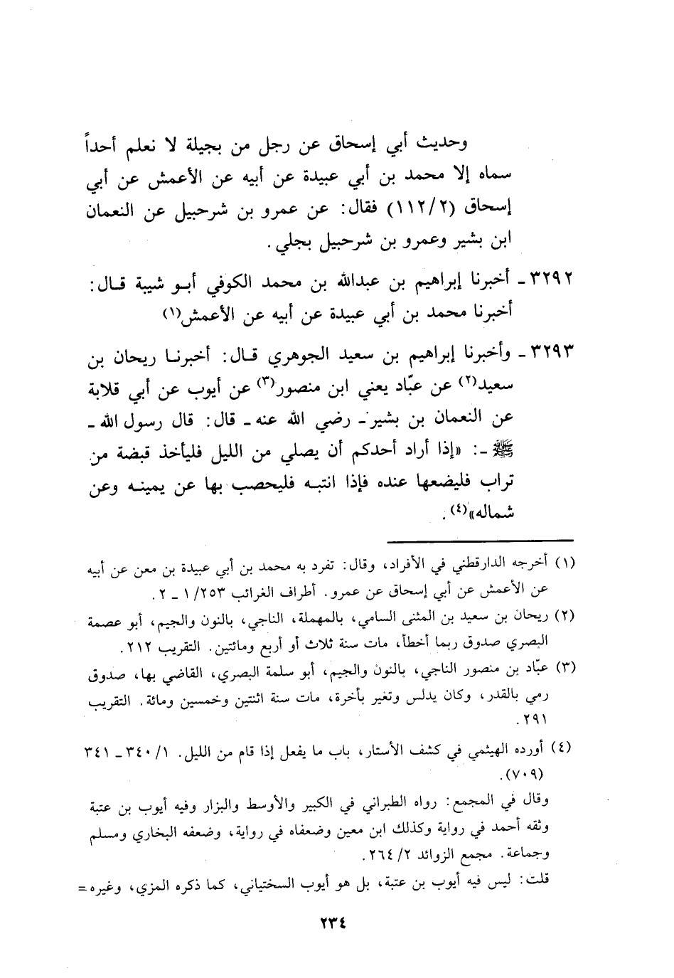 3293 - وَأَخْبَرَنَا إِبْرَاهِيمُ بْنُ سَعِيدٍ الْجَوْهَرِيُّ، قَالَ: أَخْبَرَنَا رَيْحَانُ بْنُ سَعِيدٍ، عَنْ عَبَّادٍ يَعْنِي ابْنَ مَنْصُورٍ، عَنْ أَيُّوبَ، عَنْ أَبِي قِلَابَةَ، عَنِ النُّعْمَانِ بْنِ بَشِيرٍ، رَضِيَ اللَّهُ عَنْهُ قَالَ: قَالَ رَسُولُ اللَّهِ صَلَّى اللهُ عَلَيْهِ وَسَلَّمَ: «§إِذَا أَرَادَ أَحَدُكُمْ أَنْ يُصَلِّي مِنَ اللَّيْلِ، فَلْيَأْخُذْ قَبْضَةً مِنْ تُرَابٍ فَلْيَضَعْهَا عِنْدَهُ، فَإِذَا انْتَبَهَ فَلْيَحْصِبْ بِهَا عَنْ يَمِينِهِ، وَعَنْ شِمَالِهِ» -[235]- وَهَذَا الْحَدِيثُ لَا نَعْلَمُهُ يُرْوَى عَنِ النَّبِيِّ صَلَّى اللهُ عَلَيْهِ وَسَلَّمَ إِلَّا مِنْ هَذَا الْوَجْهِ بِهَذَا الْإِسْنَادِ
