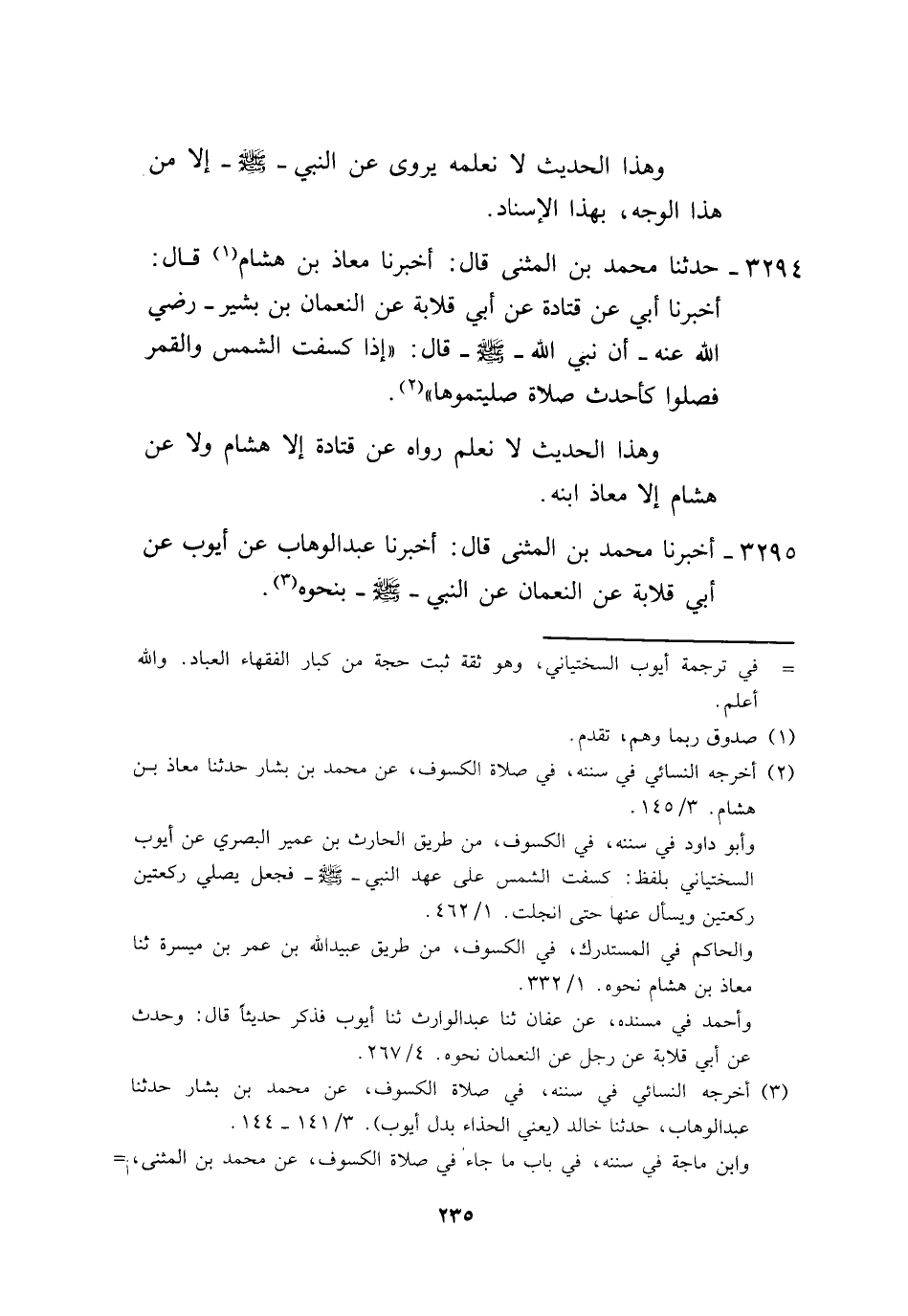 3294 - حَدَّثَنَا مُحَمَّدُ بْنُ الْمُثَنَّى، قَالَ: أَخْبَرَنَا مُعَاذُ بْنُ هِشَامٍ، قَالَ: أَخْبَرَنَا أَبِي، عَنْ قَتَادَةَ، عَنْ أَبِي قِلَابَةَ، عَنِ النُّعْمَانِ بْنِ بَشِيرٍ، رَضِيَ اللَّهُ عَنْهُ أَنَّ نَبِيَّ اللَّهِ صَلَّى اللهُ عَلَيْهِ وَسَلَّمَ قَالَ: «§إِذَا كَسَفَتِ الشَّمْسُ وَالْقَمَرُ فَصَلُّوا كَأَحْدَثِ صَلَاةٍ صَلَّيْتُمُوهَا» ، وَهَذَا الْحَدِيثُ لَا نَعْلَمُ رَوَاهُ عَنْ قَتَادَةَ إِلَّا هِشَامٌ وَلَا عَنْ هِشَامٍ إِلَّا مُعَاذٌ ابْنُهُ،