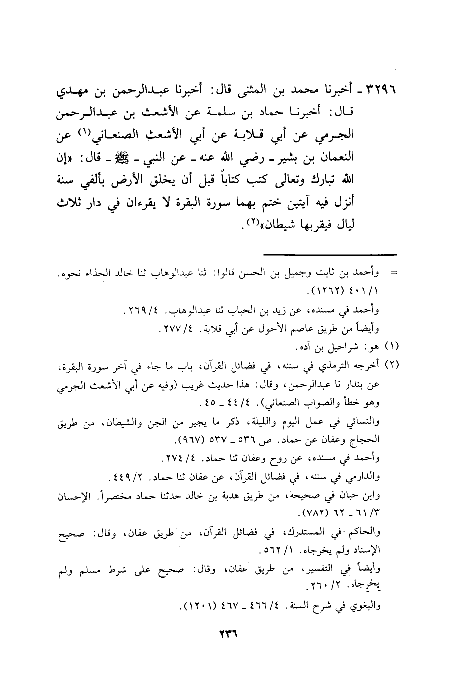3296 - أَخْبَرَنَا مُحَمَّدُ بْنُ الْمُثَنَّى، قَالَ: أَخْبَرَنَا عَبْدُ الرَّحْمَنِ بْنُ مَهْدِيٍّ، قَالَ: أَخْبَرَنَا حَمَّادُ بْنُ سَلَمَةَ، عَنِ الْأَشْعَثَ بْنِ عَبْدِ الرَّحْمَنِ الْجَرْمِيِّ، عَنْ أَبِي قِلَابَةَ، عَنْ أَبِي الْأَشْعَثَ الصَّنْعَانِيِّ، عَنِ النُّعْمَانِ بْنِ بَشِيرٍ، رَضِيَ اللَّهُ عَنْهُ عَنِ النَّبِيِّ صَلَّى اللهُ عَلَيْهِ وَسَلَّمَ قَالَ: «§إِنَّ اللَّهَ تَبَارَكَ وَتَعَالَى كَتَبَ كِتَابًا قَبْلَ أَنْ يَخْلُقَ الْأَرْضَ بِأَلْفَيْ سَنَةٍ، أَنْزَلَ فِيهِ آيَتَيْنِ خَتَمَ بِهِمَا سُورَةَ الْبَقَرَةِ، لَا يُقْرَأَانِ فِي دَارٍ ثَلَاثَ لَيَالٍ فَيَقْرَبُهَا شَيْطَانٌ»