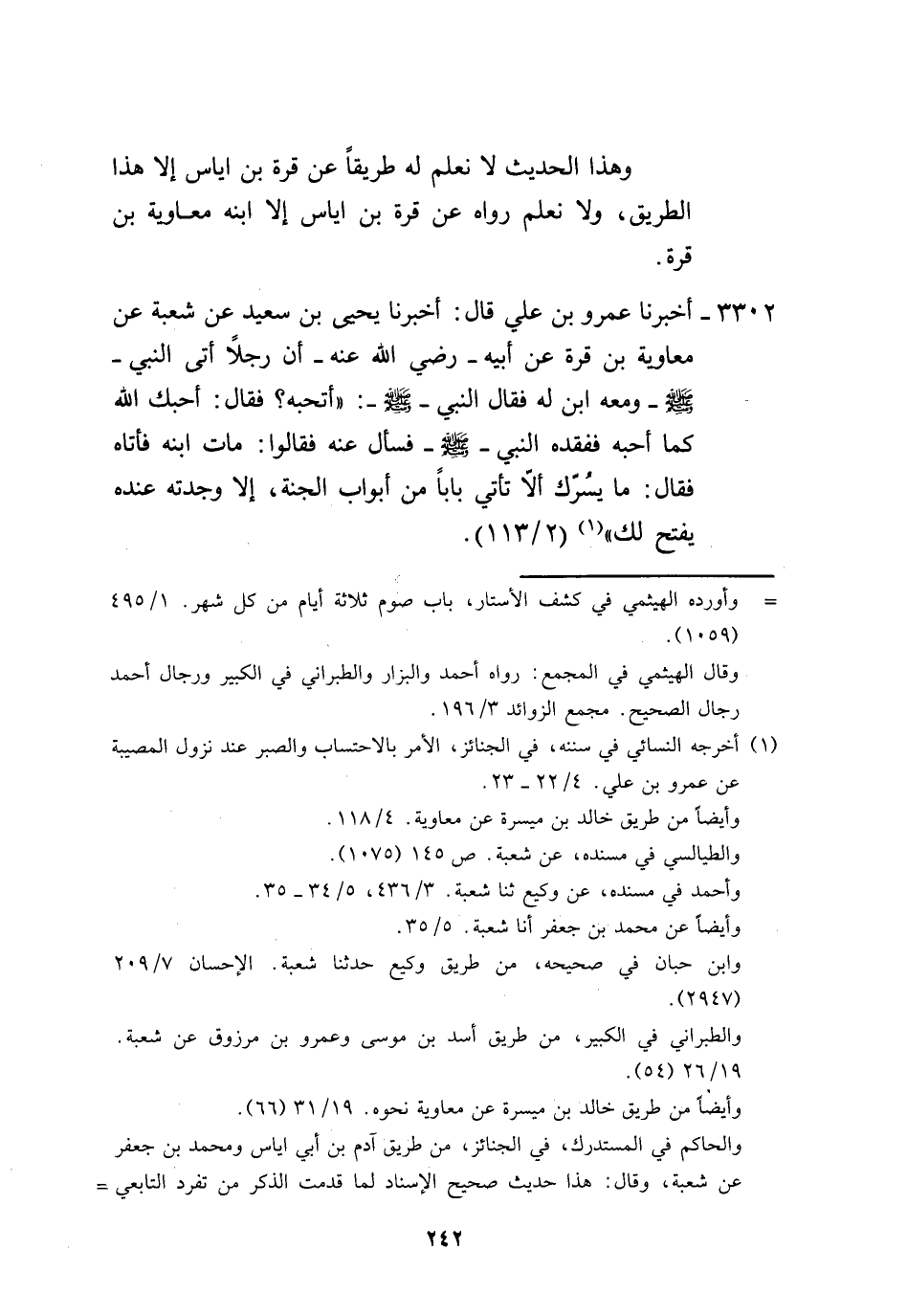 3302 - أَخْبَرَنَا عَمْرُو بْنُ عَلِيٍّ، قَالَ: أَخْبَرَنَا يَحْيَى بْنُ سَعِيدٍ، عَنْ شُعْبَةَ، عَنْ مُعَاوِيَةَ بْنِ قُرَّةَ، عَنْ أَبِيهٍ رَضِيَ اللَّهُ عَنْهُ أَنَّ رَجُلًا أَتَى النَّبِيَّ صَلَّى اللهُ عَلَيْهِ وَسَلَّمَ وَمَعَهُ ابْنٌ لَهُ، فَقَالَ النَّبِيُّ صَلَّى اللهُ عَلَيْهِ وَسَلَّمَ: «أَتُحِبُّهُ؟» ، فَقَالَ: أَحَبَّكَ اللَّهُ كَمَا أُحِبُّهُ، فَفَقَدَهُ النَّبِيُّ صَلَّى اللهُ عَلَيْهِ وَسَلَّمَ، فَسَأَلَ عَنْهُ، فَقَالُوا: مَاتَ ابْنُهُ، فَأَتَاهُ فَقَالَ: «§مَا يَسُرُّكَ أَلَّا تَأْتِي بَابًا مِنْ أَبْوَابِ الْجَنَّةِ إِلَّا وَجَدْتَهُ عِنْدَهُ يَفْتَحُ لَكَ» -[243]-، وَهَذَا الْكَلَامُ لَا نَعْلَمُ رَوَاهُ عَنِ النَّبِيِّ صَلَّى اللهُ عَلَيْهِ وَسَلَّمَ إِلَّا قُرَّةُ بْنُ إِيَاسَ