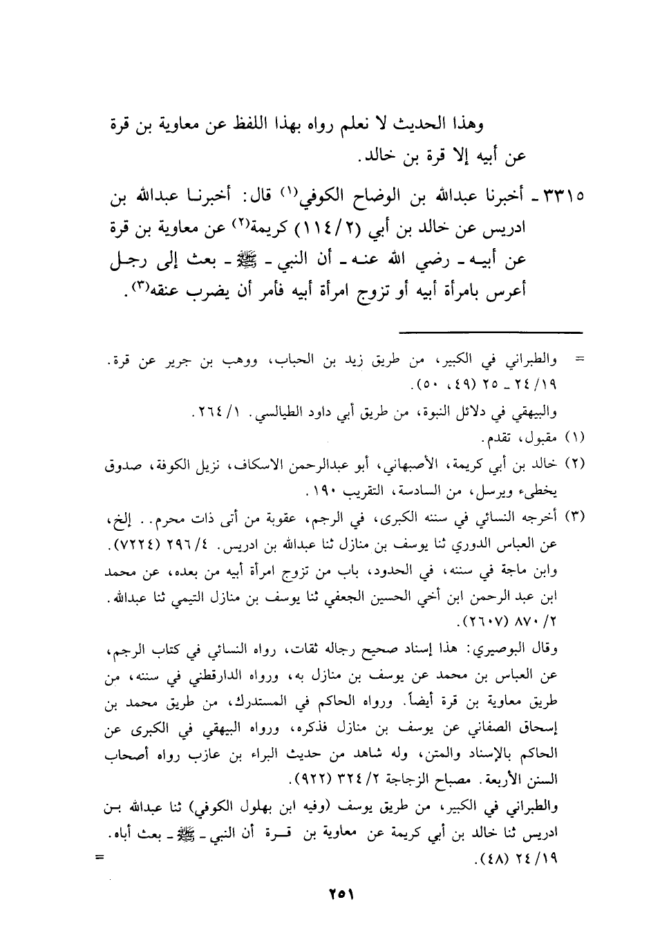 3315 - أَخْبَرَنَا عَبْدُ اللَّهِ بْنُ الْوَضَّاحِ الْكُوفِيُّ، قَالَ: أَخْبَرَنَا عَبْدُ اللَّهِ بْنُ إِدْرِيسَ، عَنْ خَالِدِ بْنِ أَبِي كَرِيمَةَ، عَنْ مُعَاوِيَةَ بْنِ قُرَّةَ، عَنْ أَبِيهٍ رَضِيَ اللَّهُ عَنْهُ «أَنَّ النَّبِيَّ صَلَّى اللهُ عَلَيْهِ وَسَلَّمَ بَعَثَ إِلَى رَجُلٍ أَعْرَسَ بِامْرَأَةِ أَبِيهِ أَوْ تَزَوَّجَ امْرَأَةَ أَبِيهِ، §فَأَمَرَ أَنْ يُضْرَبَ عُنُقُهُ» -[252]-، وَهَذَا الْحَدِيثُ لَا نَعْلَمُ أَحَدًا رَوَاهُ عَنْ مُعَاوِيَةَ بْنِ قُرَّةَ عَنْ أَبِيهِ إِلَّا خَالِدُ بْنُ أَبِي كَرِيمَةَ وَلَا عَنْ خَالِدٍ إِلَّا ابْنُ إِدْرِيسَ، وَلَا نَعْلَمُ رَوَاهُ عَنِ ابْنِ إِدْرِيسَ إِلَّا يُوسُفُ بْنُ مَنَازِلَ وَعَبْدُ اللَّهِ بْنُ الْوَضَّاحِ، وَغَيْرُهُمَا يُحَدِّثُ بِهِ عَنِ ابْنِ إِدْرِيسَ عَنْ خَالِدِ بْنِ أَبِي كَرِيمَةَ عَنْ مُعَاوِيَةَ بْنِ قُرَّةَ مُرْسَلًا