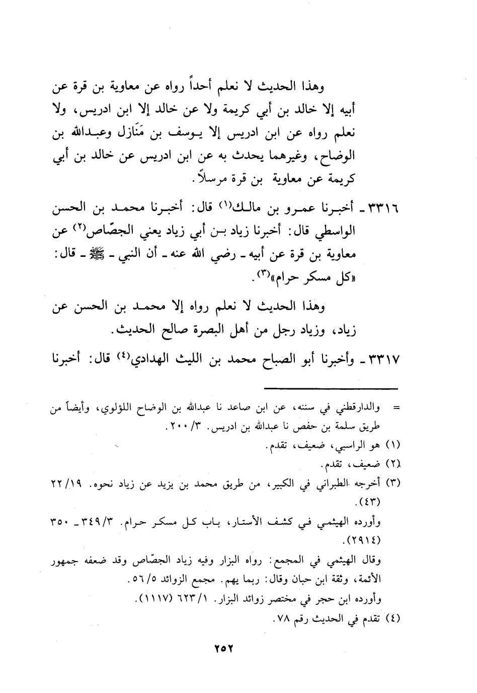 3316 - أَخْبَرَنَا عَمْرُو بْنُ مَالِكٍ، قَالَ: أَخْبَرَنَا مُحَمَّدُ بْنُ الْحَسَنِ الْوَاسِطِيُّ، قَالَ: أَخْبَرَنَا زِيَادُ بْنُ أَبِي زِيَادٍ يَعْنِي الْجَصَّاصَ، عَنْ مُعَاوِيَةَ بْنِ قُرَّةَ، عَنْ أَبِيهٍ رَضِيَ اللَّهُ عَنْهُ أَنَّ النَّبِيَّ صَلَّى اللهُ عَلَيْهِ وَسَلَّمَ قَالَ: «§كُلُّ مُسْكِرٍ حَرَامٌ» ، وَهَذَا الْحَدِيثُ لَا نَعْلَمُ رَوَاهُ إِلَّا مُحَمَّدُ بْنُ الْحَسَنِ عَنْ زِيَادٍ، وَزِيَادٌ رَجُلٌ مِنْ أَهْلِ الْبَصْرَةِ صَالِحُ الْحَدِيثِ