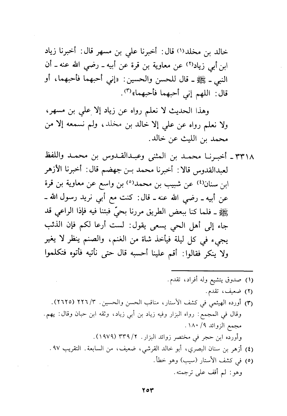 3318 - أَخْبَرَنَا مُحَمَّدُ بْنُ الْمُثَنَّى، وَعَبْدُ الْقُدُّوسِ بْنُ مُحَمَّدٍ، وَاللَّفْظُ لِعَبْدِ الْقُدُّوسِ، قَالَا: أَخْبَرَنَا مُحَمَّدُ بْنُ جَهْضَمٍ، قَالَ: أَخْبَرَنَا الْأَزْهَرُ بْنُ سِنَانٍ، عَنْ شَبِيبِ بْنِ مُحَمَّدِ بْنِ وَاسِعٍ، عَنْ مُعَاوِيَةَ بْنِ قُرَّةَ، عَنْ أَبِيهٍ رَضِيَ اللَّهُ عَنْهُ قَالَ: كُنْتُ مَعَ أَبِي نُرِيدُ رَسُولَ اللَّهِ صَلَّى اللهُ عَلَيْهِ وَسَلَّمَ، فَلَمَّا كُنَّا بِبَعْضِ الطَّرِيقِ مَرَرْنَا بِحَيٍّ فَبِتْنَا فِيهِ، فَإِذَا الرَّاعِي قَدْ جَاءَ إِلَى أَهْلِ الْحَيِّ يَسْعَى، يَقُولُ: لَسْتُ أَرْعَى لَكُمْ، فَإِنَّ الذِّئْبَ يَجِيءُ فِي كُلِّ لَيْلَةٍ فَيَأْخُذُ شَاةً مِنَ الْغَنَمِ، وَالصَّنَمُ يَنْظُرُ لَا يُغَيِّرُ وَلَا يُنْكِرُ، فَقَالُوا: أَقِمْ عَلَيْنَا - أَحْسِبُهُ قَالَ: حَتَّى نَأْتِيَهُ - فَأَتَوْهُ، فَتَكَلَّمُوا -[254]- حَوْلَهُ، وَقَالَ لِلرَّاعِي: أَقِمِ اللَّيْلَةَ، فَقَالَ أَبِي: أُقِيمُ اللَّيْلَةَ حَتَّى نَنْظُرَ، فَبِتْنَا لَيْلَتَنَا، فَلَمَّا كَانَ صَلَاةُ الْغَدَاةِ، إِذَا الرَّاعِي يَشْتَدُّ إِلَى أَهْلِ الْقَرْيَةِ، يَقُولُ لَهُمُ: الْبُشْرَى أَلَا تَرَوْنَ أَنَّ الذِّئْبَ مَرْبُوطٌ بَيْنَ يَدَيِ الصَّنَمِ بِغَيْرِ وَثَاقٍ، فَجَاءُوا وَجِئْنَا مَعَهُمْ، قَالَ: فَقَالَ: نَعَمْ هَكَذَا فَاصْنَعْ فَقَدِمْنَا عَلَى رَسُولِ اللَّهِ، صَلَّى اللهُ عَلَيْهِ وَسَلَّمَ، فَحَدَّثَهُ أَبِي الْحَدِيثَ، فَقَالَ: «§يَلْعَبُ بِهِمُ الشَّيْطَانُ» -[255]-، وَهَذَا الْحَدِيثُ لَا نَعْلَمُهُ يُرْوَى بِهَذَا اللَّفْظِ إِلَّا عَنْ قُرَّةَ بْنِ إِيَاسَ، وَلَا نَعْلَمُ لَهُ طَرِيقًا غَيْرَ هَذَا الطَّرِيقِ، وَالْأَزْهَرُ بْنُ سِنَانٍ حَدَّثَ عَنْهُ يَزِيدُ بْنُ هَارُونَ وَمُحَمَّدُ بْنُ جَهْضَمٍ وَغَيْرُهُمَا