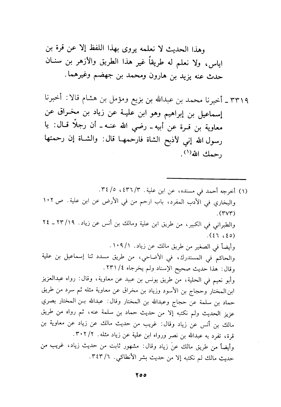 3319 - أَخْبَرَنَا مُحَمَّدُ بْنُ عَبْدِ اللَّهِ بْنِ بَزِيعِ، وَمُؤَمَّلُ بْنُ هِشَامٍ، قَالَا: أَخْبَرَنَا إِسْمَاعِيلُ بْنُ إِبْرَاهِيمَ وَهُوَ ابْنُ عُلَيَّةَ، عَنْ زِيَادِ بْنِ مِخْرَاقٍ، عَنْ مُعَاوِيَةَ بْنِ قُرَّةَ، عَنْ أَبِيهٍ رَضِيَ اللَّهُ عَنْهُ أَنَّ رَجُلًا قَالَ: يَا رَسُولَ اللَّهِ، إِنِّي لَأَذْبَحُ الشَّاةَ فَأَرْحَمُهَا، قَالَ: «§وَالشَّاةُ إِنْ رَحِمْتَهَا رَحِمَكَ اللَّهُ»