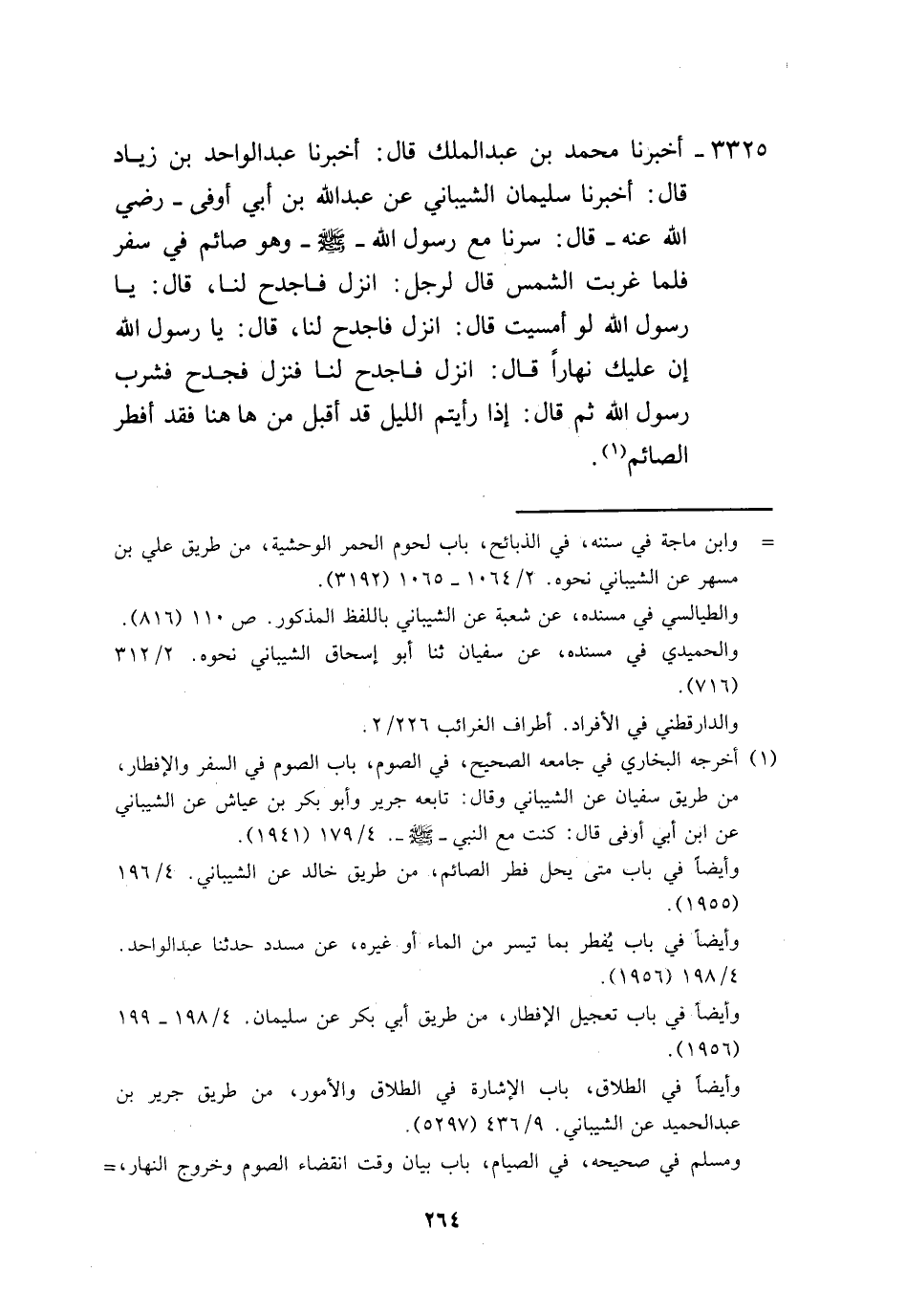 3325 - أَخْبَرَنَا مُحَمَّدُ بْنُ عَبْدِ الْمَلِكِ، قَالَ: أَخْبَرَنَا عَبْدُ الْوَاحِدِ بْنُ زِيَادٍ، قَالَ: أَخْبَرَنَا سُلَيْمَانُ الشَّيْبَانِيُّ، عَنْ عَبْدِ اللَّهِ بْنِ أَبِي أَوْفَى رَضِيَ اللَّهُ عَنْهُ قَالَ: سِرْنَا مَعَ رَسُولِ اللَّهِ صَلَّى اللهُ عَلَيْهِ وَسَلَّمَ وَهُوَ صَائِمٌ فِي سَفَرٍ، فَلَمَّا غَرَبَتِ الشَّمْسُ قَالَ لِرَجُلٍ: «انْزِلْ فَاجْدَحْ لَنَا» ، قَالَ: يَا رَسُولَ اللَّهِ، لَوْ أَمْسَيْتَ، قَالَ: «انْزِلْ فَاجْدَحْ لَنَا» ، قَالَ: يَا رَسُولَ اللَّهِ، إِنَّ عَلَيْكَ نَهَارًا، قَالَ: «انْزِلْ فَاجْدَحْ لَنَا» ، فَنَزَلَ فَجَدَحَ فَشَرِبَ رَسُولُ اللَّهِ، ثُمَّ قَالَ: «§إِذَا رَأَيْتُمُ اللَّيْلَ قَدْ أَقْبَلَ مِنْ هَاهُنَا فَقَدْ أَفْطَرَ الصَّائِمُ» -[265]-، وَهَذَا الْحَدِيثُ لَا نَعْلَمُ أَحَدًا رَوَاهُ عَنْ رَسُولِ اللَّهِ صَلَّى اللهُ عَلَيْهِ وَسَلَّمَ بِهَذَا اللَّفْظِ إِلَّا عَبْدُ اللَّهِ بْنُ أَبِي أَوْفَى وَلَا نَعْلَمُ لَهُ طَرِيقًا عَنْهُ إِلَّا الشَّيْبَانِيَّ