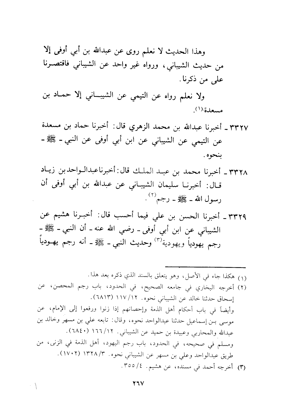 3329 - أَخْبَرَنَا الْحَسَنُ بْنُ عَلِيٍّ، فِيمَا أَحْسِبُ قَالَ: أَخْبَرَنَا هُشَيْمٌ، عَنِ الشَّيْبَانِيِّ، عَنِ ابْنِ أَبِي أَوْفَى رَضِيَ اللَّهُ عَنْهُ «أَنَّ النَّبِيَّ صَلَّى اللهُ عَلَيْهِ وَسَلَّمَ §رَجَمَ يَهُودِيًّا وَيَهُودِيَّةً» ، وَحَدِيثُ النَّبِيِّ صَلَّى اللهُ عَلَيْهِ وَسَلَّمَ أَنَّهُ رَجَمَ يَهُودِيًّا -[268]- وَيَهُودِيَّةً لَا نَعْلَمُ رَوَاهُ عَنِ الشَّيْبَانِيِّ إِلَّا هُشَيْمًا وَحْدَهُ