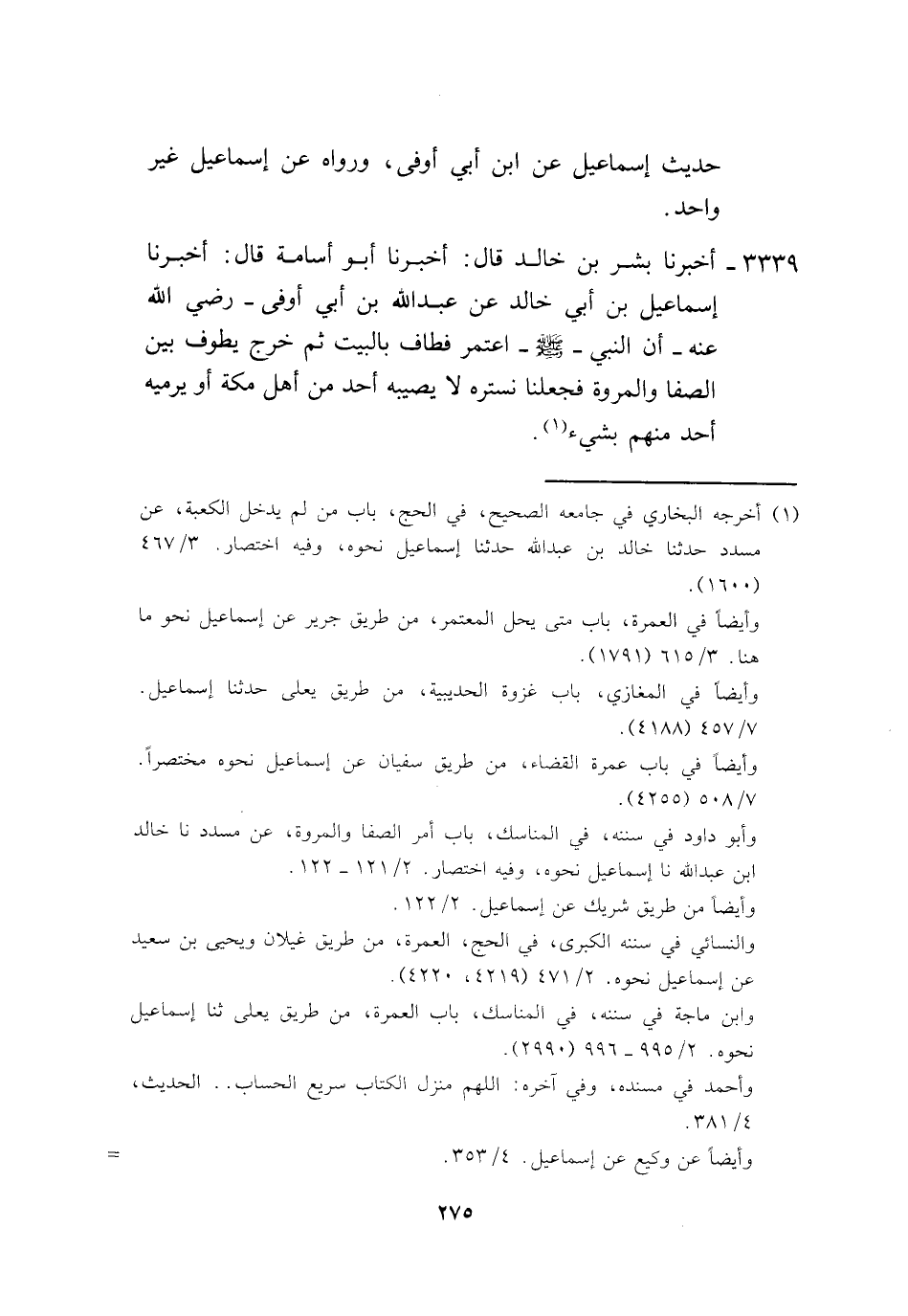 3339 - أَخْبَرَنَا بِشْرُ بْنُ خَالِدٍ، قَالَ: أَخْبَرَنَا أَبُو أُسَامَةَ، قَالَ: أَخْبَرَنَا إِسْمَاعِيلُ بْنُ أَبِي خَالِدٍ، عَنْ عَبْدِ اللَّهِ بْنِ أَبِي أَوْفَى، رَضِيَ اللَّهُ عَنْهُ «أَنَّ §النَّبِيَّ صَلَّى اللهُ عَلَيْهِ وَسَلَّمَ اعْتَمَرَ فَطَافَ بِالْبَيْتِ، ثُمَّ خَرَجَ يَطُوفُ بَيْنَ الصَّفَا وَالْمَرْوَةِ، فَجَعَلْنَا نَسْتُرُهُ لَا يُصِيبُهُ أَحَدٌ مِنْ أَهْلِ مَكَّةَ، أَوْ يَرْمِيهِ أَحَدٌ مِنْهُمْ بِشَيْءٍ» -[276]-، وَهَذَا الْحَدِيثُ لَا نَعْلَمُ لَهُ طَرِيقًا عَنِ ابْنِ أَبِي أَوْفَى إِلَّا هَذَا، الطَّرِيقَ وَرَوَاهُ غَيْرُ وَاحِدٍ عَنْ إِسْمَاعِيلَ