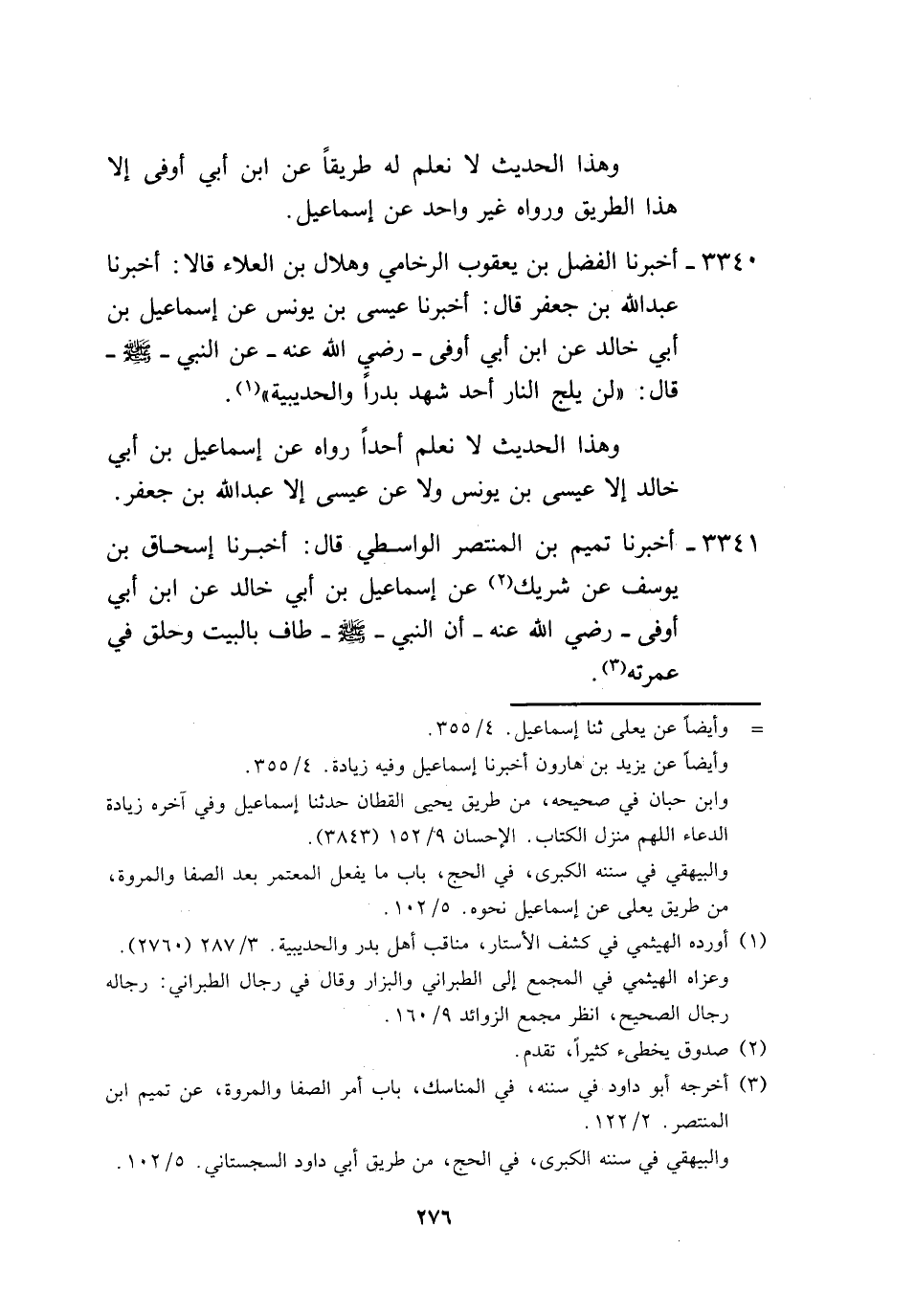 3340 - أَخْبَرَنَا الْفَضْلُ بْنُ يَعْقُوبَ الرُّخَامِيُّ، وَهِلَالُ بْنُ الْعَلَاءِ، قَالَا: أَخْبَرَنَا عَبْدُ اللَّهِ بْنُ جَعْفَرٍ، قَالَ: أَخْبَرَنَا عِيسَى بْنُ يُونُسَ، عَنْ إِسْمَاعِيلَ بْنِ أَبِي خَالِدٍ، عَنِ ابْنِ أَبِي أَوْفَى، رَضِيَ اللَّهُ عَنْهُ عَنِ النَّبِيِّ صَلَّى اللهُ عَلَيْهِ وَسَلَّمَ قَالَ: «§لَنْ يَلِجَ النَّارَ أَحَدٌ شَهِدَ بَدْرًا وَالْحُدَيْبِيَةَ» ، وَهَذَا الْحَدِيثُ لَا نَعْلَمُ أَحَدًا رَوَاهُ عَنْ إِسْمَاعِيلَ بْنِ أَبِي خَالِدٍ إِلَّا عِيسَى بْنُ يُونُسَ، وَلَا عَنْ عِيسَى إِلَّا عَبْدُ اللَّهِ بْنُ جَعْفَرٍ