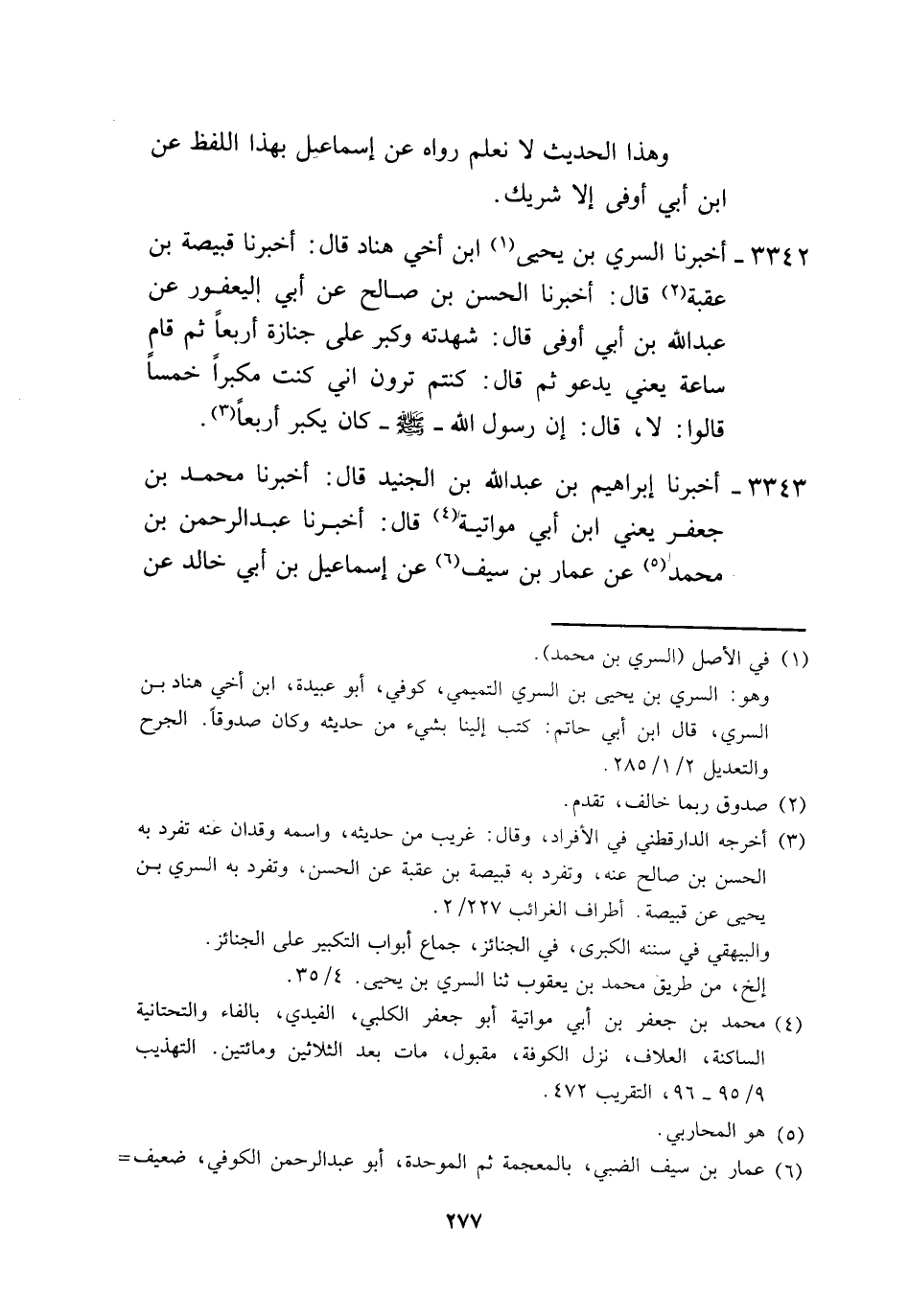 3342 - أَخْبَرَنَا السَّرِيُّ بْنُ يَحْيَى ابْنُ أَخِي هَنَّادٍ قَالَ: أَخْبَرَنَا قَبِيصَةُ بْنُ عُقْبَةَ، قَالَ: أَخْبَرَنَا الْحَسَنُ بْنُ صَالِحٍ، عَنْ أَبِي الْيَعْفُورِ، عَنْ عَبْدِ اللَّهِ بْنِ أَبِي أَوْفَى، قَالَ: شَهِدْتُهُ وَكَبَّرَ عَلَى جَنَازَةٍ أَرْبَعًا، ثُمَّ قَامَ سَاعَةً يَعْنِي يَدْعُو، ثُمَّ قَالَ: «كُنْتُمْ تَرَوْنَ أَنِّي كُنْتُ مُكَبِّرًا خَمْسًا» ، قَالُوا: لَا، قَالَ: «إِنَّ §رَسُولَ اللَّهِ صَلَّى اللهُ عَلَيْهِ وَسَلَّمَ كَانَ يُكَبِّرُ أَرْبَعًا»