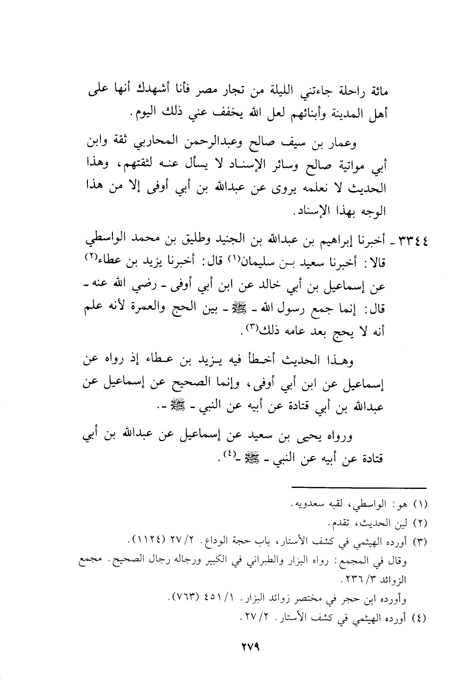 3344 - أَخْبَرَنَا إِبْرَاهِيمُ بْنُ عَبْدِ اللَّهِ بْنِ الْجُنَيْدِ، وَطَلِيقُ بْنُ مُحَمَّدٍ الْوَاسِطِيُّ، قَالَا: أَخْبَرَنَا سَعِيدُ بْنُ سُلَيْمَانَ، قَالَ: أَخْبَرَنَا يَزِيدُ بْنُ عَطَاءٍ، عَنْ إِسْمَاعِيلَ بْنِ أَبِي خَالِدٍ، عَنِ ابْنِ أَبِي أَوْفَى، رَضِيَ اللَّهُ عَنْهُ قَالَ: «إِنَّمَا §جَمَعَ رَسُولُ اللَّهِ صَلَّى اللهُ عَلَيْهِ وَسَلَّمَ بَيْنَ الْحَجِّ وَالْعُمْرَةِ لِأَنَّهُ عَلِمَ أَنَّهُ لَا يَحُجُّ بَعْدَ عَامِهِ ذَلِكَ» ، وَهَذَا الْحَدِيثُ أَخْطَأَ فِيهِ يَزِيدُ بْنُ عَطَاءٍ إِذْ رَوَاهُ عَنْ إِسْمَاعِيلَ عَنِ ابْنِ أَبِي أَوْفَى، وَإِنَّمَا الصَّحِيحُ عَنْ إِسْمَاعِيلُ عَنْ عَبْدِ اللَّهِ بْنِ أَبِي قَتَادَةَ عَنْ أَبِيهِ عَنِ النَّبِيِّ صَلَّى اللهُ عَلَيْهِ وَسَلَّمَ، وَرَوَاهُ يَحْيَى بْنُ سَعِيدٍ، عَنْ إِسْمَاعِيلَ عَنْ عَبْدِ اللَّهِ بْنِ أَبِي قَتَادَةَ عَنْ أَبِيهِ عَنِ النَّبِيِّ صَلَّى اللهُ عَلَيْهِ وَسَلَّمَ