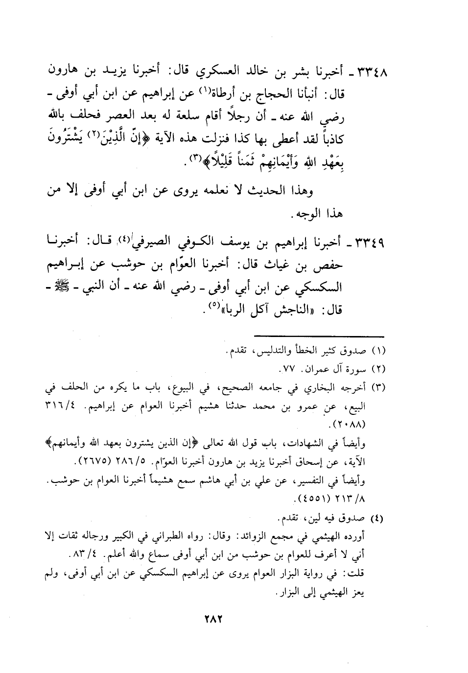 3348 - أَخْبَرَنَا بِشْرُ بْنُ خَالِدٍ الْعَسْكَرِيُّ، قَالَ: أَخْبَرَنَا يَزِيدُ بْنُ هَارُونَ، قَالَ: أَنْبَأَنَا الْحَجَّاجُ بْنُ أَرْطَاةَ، عَنْ إِبْرَاهِيمَ، عَنِ ابْنِ أَبِي أَوْفَى رَضِيَ اللَّهُ عَنْهُ " أَنَّ رَجُلًا أَقَامَ سِلْعَةً لَهُ بَعْدَ الْعَصْرِ، فَحَلَفَ بِاللَّهِ كَاذِبًا لَقَدْ أَعْطَى بِهَا كَذَا، فَنَزَلَتْ هَذِهِ الْآيَةُ {§إِنَّ الَّذِينَ يَشْتَرُونَ بِعَهْدِ اللَّهِ وَأَيْمَانِهِمْ ثَمَنًا قَلِيلًا} [آل عمران: 77] "، وَهَذَا الْحَدِيثُ لَا نَعْلَمُهُ يُرْوَى عَنِ ابْنِ أَبِي أَوْفَى إِلَّا مِنْ هَذَا الْوَجْهِ