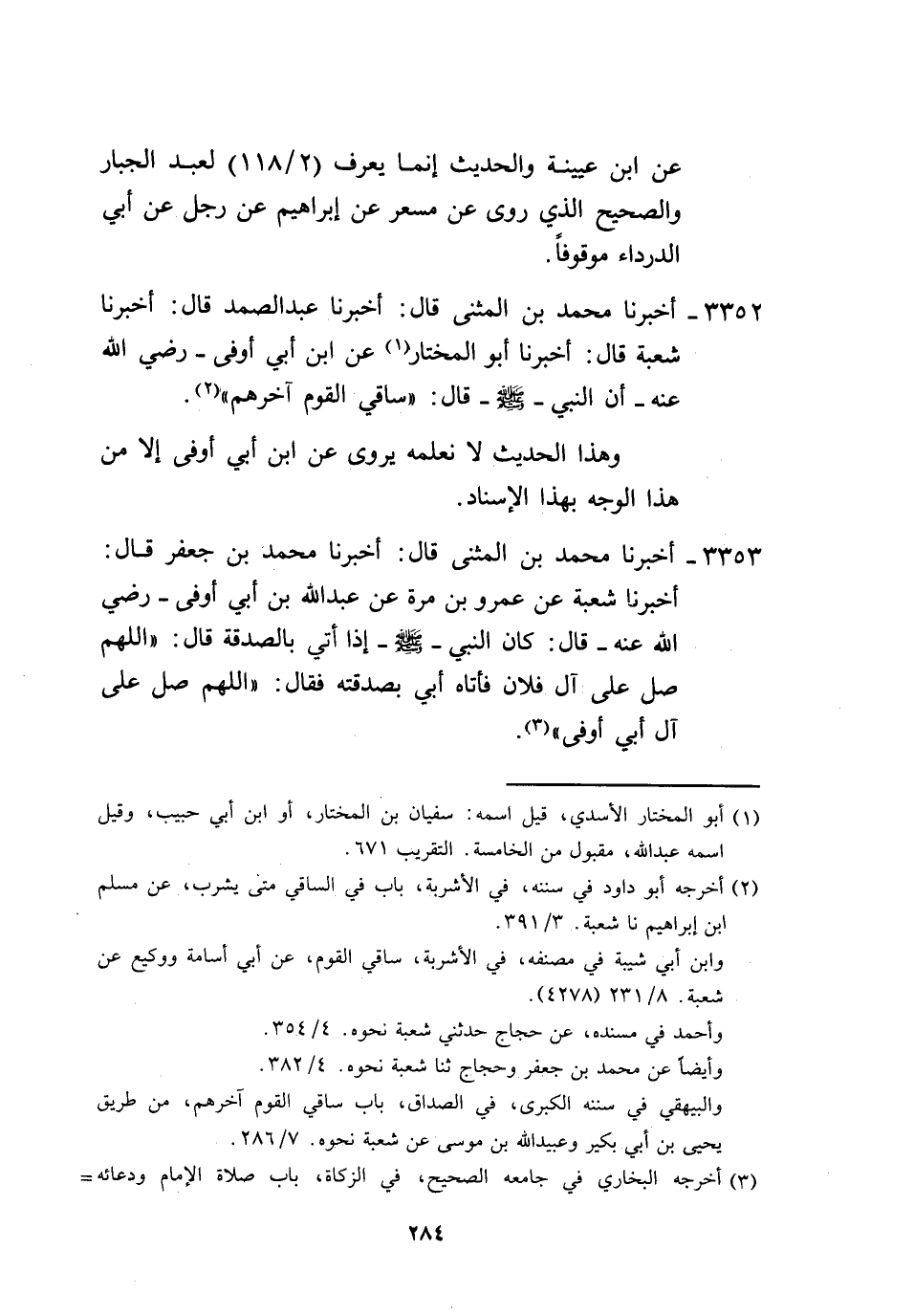 3352 - أَخْبَرَنَا مُحَمَّدُ بْنُ الْمُثَنَّى، قَالَ: أَخْبَرَنَا عَبْدُ الصَّمَدِ، قَالَ: أَخْبَرَنَا شُعْبَةُ، قَالَ: أَخْبَرَنَا أَبُو الْمُخْتَارِ، عَنِ ابْنِ أَبِي أَوْفَى، رَضِيَ اللَّهُ عَنْهُ أَنَّ النَّبِيَّ صَلَّى اللهُ عَلَيْهِ وَسَلَّمَ قَالَ: «§سَاقِي الْقَوْمِ آخِرُهُمْ» ، وَهَذَا الْحَدِيثُ لَا نَعْلَمُهُ يُرْوَى عَنِ ابْنِ أَبِي أَوْفَى إِلَّا مِنْ هَذَا الْوَجْهِ بِهَذَا الْإِسْنَادِ