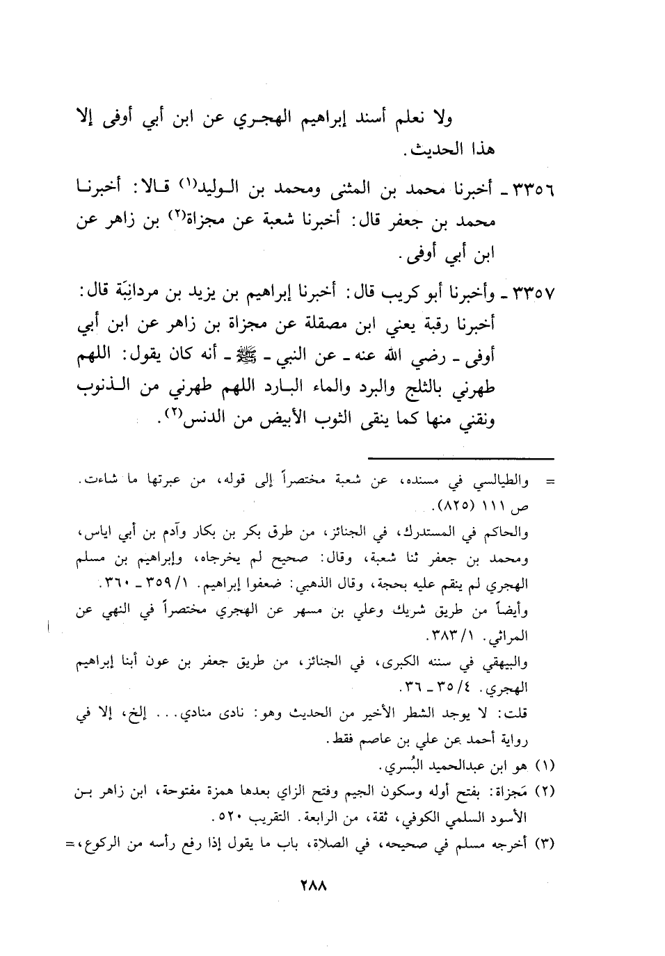 3357 - أَخْبَرَنَا أَبُو كُرَيْبٍ، قَالَ: أَخْبَرَنَا إِبْرَاهِيمُ بْنُ يَزِيدَ بْنِ مَرْدَانُبَةَ، قَالَ: أَخْبَرَنَا رَقَبَةُ يَعْنِي ابْنَ مَصْقَلَةَ، عَنْ مِجْزَاةَ بْنِ زَاهِرٍ، عَنِ ابْنِ أَبِي أَوْفَى رَضِيَ اللَّهُ عَنْهُ عَنِ النَّبِيِّ صَلَّى اللهُ عَلَيْهِ وَسَلَّمَ أَنَّهُ كَانَ يَقُولُ: «§اللَّهُمَّ طَهِّرْنِي بِالثَّلْجِ وَالْبَرَدِ وَالْمَاءِ الْبَارِدِ، اللَّهُمَّ طَهِّرْنِي مِنَ الذُّنُوبِ وَنَقِّنِي مِنْهَا كَمَا يُنَقَّى الثَّوْبُ الْأَبْيَضُ مِنَ الدَّنَسِ»