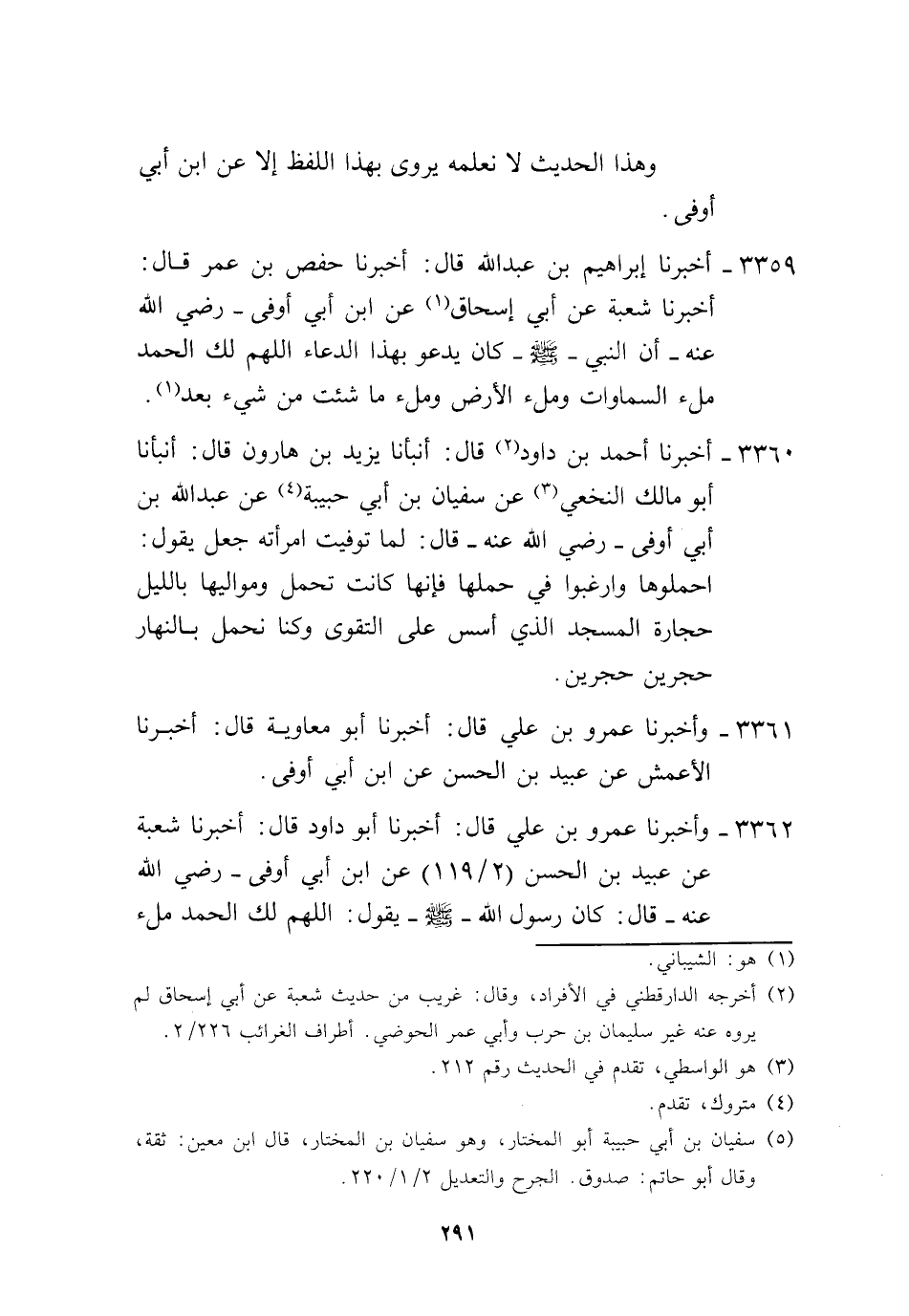 3359 - أَخْبَرَنَا إِبْرَاهِيمُ بْنُ عَبْدِ اللَّهِ، قَالَ: أَخْبَرَنَا حَفْصُ بْنُ عُمَرَ، قَالَ: أَخْبَرَنَا شُعْبَةُ، عَنْ أَبِي إِسْحَاقَ، عَنِ ابْنِ أَبِي أَوْفَى رَضِيَ اللَّهُ عَنْهُ أَنَّ النَّبِيَّ صَلَّى اللهُ عَلَيْهِ وَسَلَّمَ كَانَ يَدْعُو بِهَذَا الدُّعَاءِ: «§اللَّهُمَّ لَكَ الْحَمْدُ مِلْءُ السَّمَاوَاتِ وَمِلْءُ الْأَرْضِ وَمِلْءُ مَا شِئْتَ مِنْ شَيْءٍ بَعْدُ»