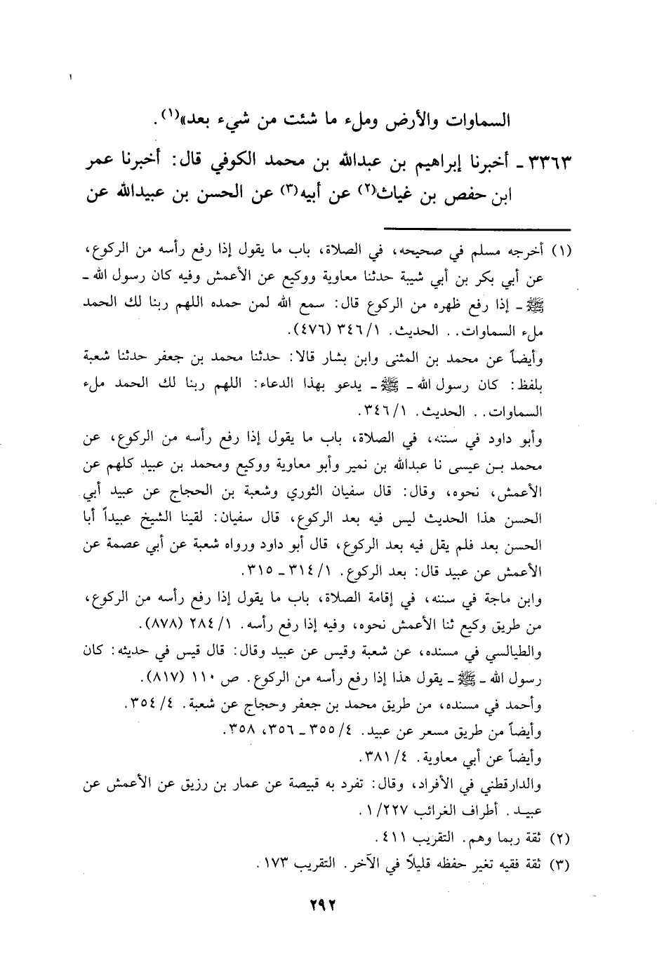 3363 - أَخْبَرَنَا إِبْرَاهِيمُ بْنُ عَبْدِ اللَّهِ بْنِ مُحَمَّدٍ الْكُوفِيِّ، قَالَ: أَخْبَرَنَا عُمَرُ بْنُ حَفْصِ بْنِ غِيَاثٍ، عَنْ أَبِيهِ، عَنِ الْحَسَنِ بْنِ عُبَيْدِ اللَّهِ، عَنْ -[293]- عَطَاءِ بْنِ السَّائِبِ، عَنْ عَبْدِ اللَّهِ بْنِ أَبِي أَوْفَى، رَضِيَ اللَّهُ عَنْهُ أَنَّ رَسُولَ اللَّهِ صَلَّى اللهُ عَلَيْهِ وَسَلَّمَ كَانَ يَقُولُ: «§اللَّهُمَّ طَهِّرْنِي بِالثَّلْجِ وَالْبَرَدِ وَالْمَاءِ الْبَارِدِ، اللَّهُمَّ نَقِّنِي مِنَ الذُّنُوبِ وَالْخَطَايَا كَمَا يُنَقَّى الثَّوْبُ الْأَبْيَضُ مِنَ الدَّنَسِ» ، وَلَا نَعْلَمُ أَسْنَدَ عَطَاءُ بْنُ السَّائِبِ عَنِ ابْنِ أَبِي أَوْفَى إِلَّا هَذَا الْحَدِيثَ، وَلَا رَوَى هَذَا الْحَدِيثَ عَنِ الْحَسَنِ بْنِ عُبَيْدِ اللَّهِ عَنْ عَطَاءٍ إِلَّا حَفْصُ بْنُ غِيَاثٍ