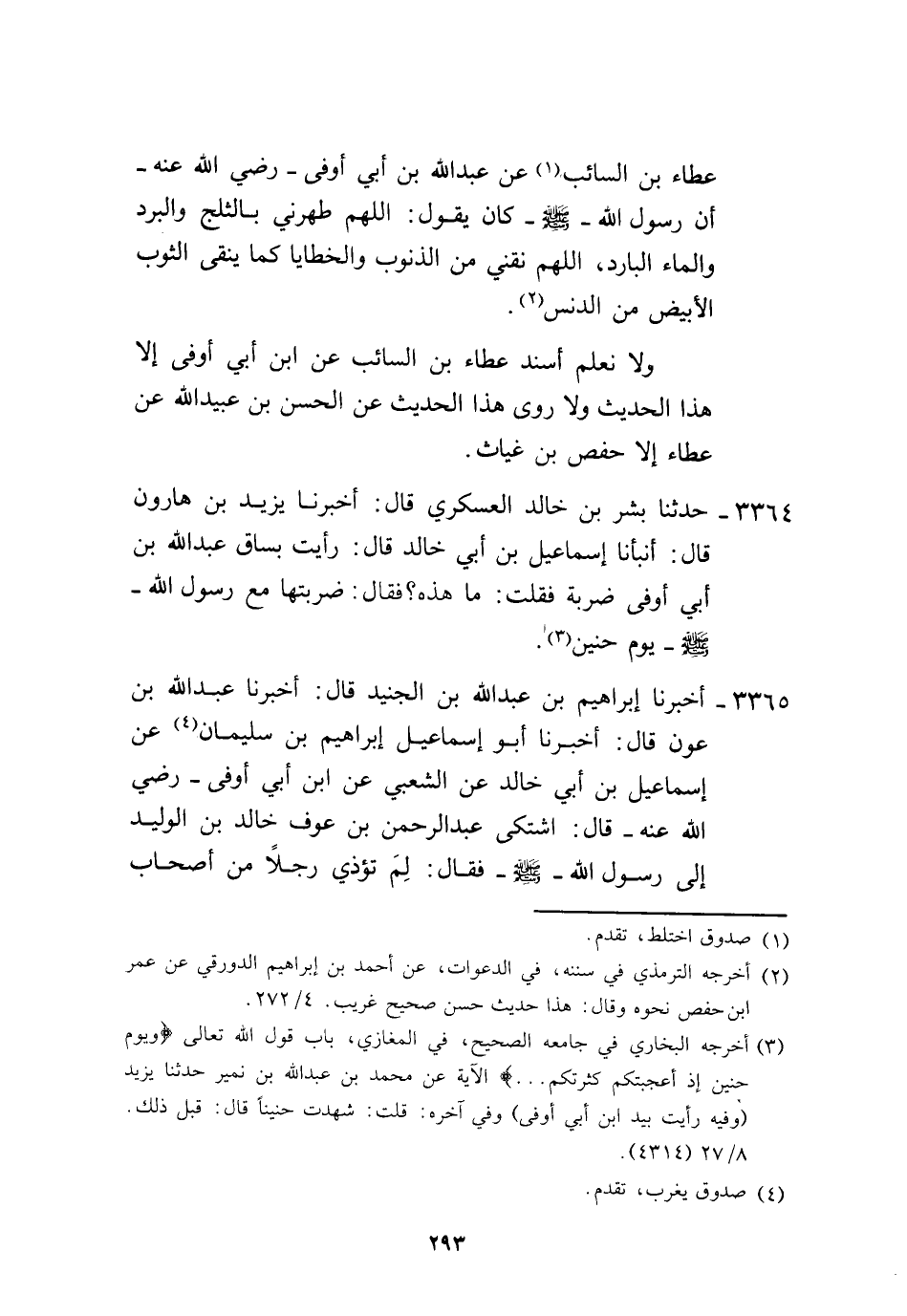 3364 - حَدَّثَنَا بِشْرُ بْنُ خَالِدٍ الْعَسْكَرِيُّ، قَالَ: أَخْبَرَنَا يَزِيدُ بْنُ هَارُونَ، قَالَ: أَنْبَأَنَا إِسْمَاعِيلُ بْنُ أَبِي خَالِدٍ، قَالَ: رَأَيْتُ بِسَاقِ عَبْدِ اللَّهِ بْنِ أَبِي أَوْفَى ضَرْبَةً، فَقُلْتُ: مَا هَذِهِ؟، فَقَالَ: «§ضُرِبْتُهَا مَعَ رَسُولِ اللَّهِ صَلَّى اللهُ عَلَيْهِ وَسَلَّمَ يَوْمَ حُنَيْنٍ»