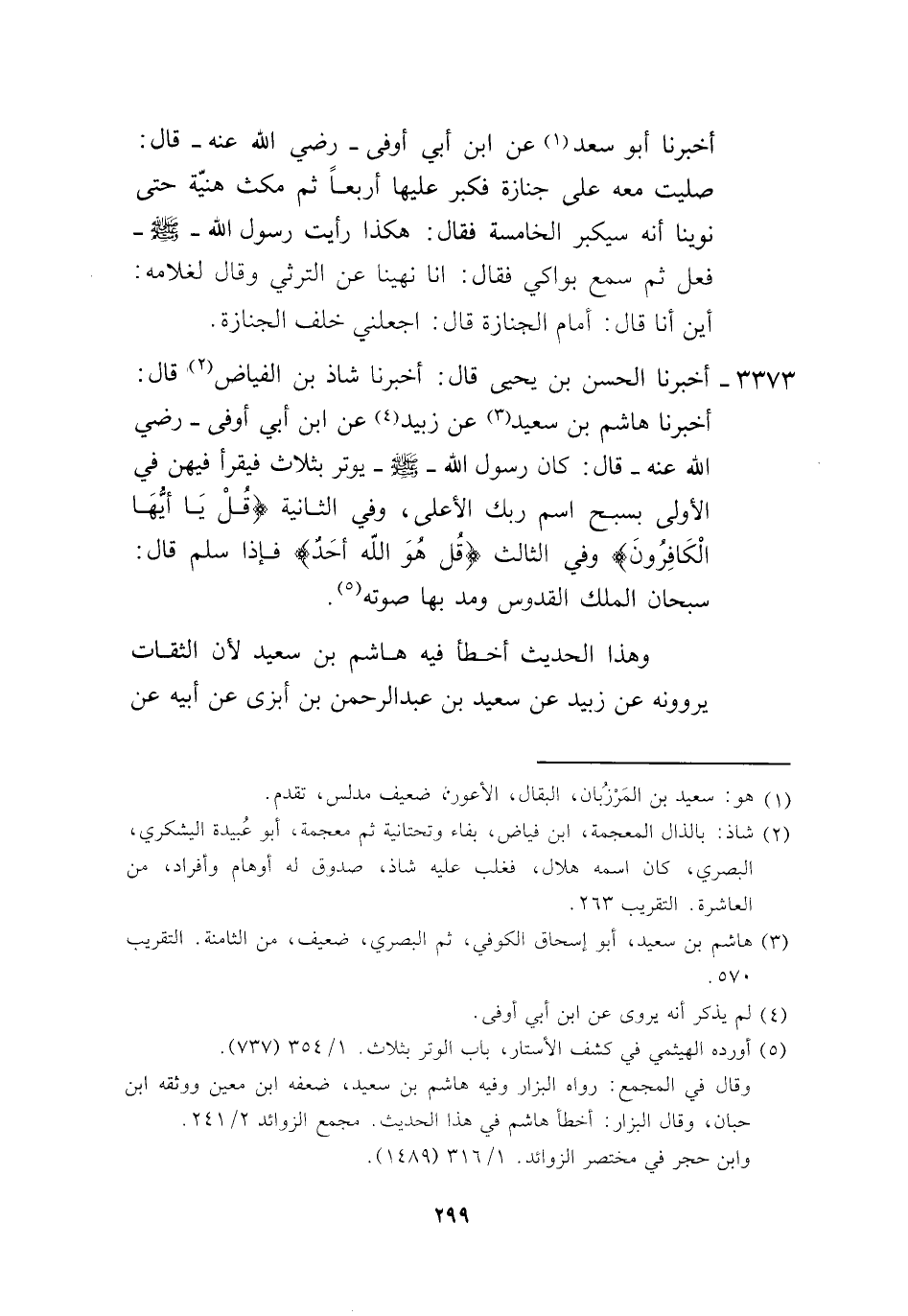 3373 - أَخْبَرَنَا الْحَسَنُ بْنُ يَحْيَى، قَالَ: أَخْبَرَنَا شَاذُّ بْنُ الْفَيَّاضِ، قَالَ: أَخْبَرَنَا هَاشِمُ بْنُ سَعِيدٍ، عَنْ زُبَيْدٍ، عَنِ ابْنِ أَبِي أَوْفَى، رَضِيَ اللَّهُ عَنْهُ قَالَ: كَانَ رَسُولُ اللَّهِ صَلَّى اللهُ عَلَيْهِ وَسَلَّمَ §يُوتِرُ بِثَلَاثٍ، فَيَقْرَأُ فِيهِنَّ فِي الْأُولَى بِسَبِّحِ اسْمَ رَبِّكَ الْأَعْلَى، وَفِي الثَّانِيَةِ قُلْ يَا أَيُّهَا الْكَافِرُونَ، وَفِي الثَّالِثَةِ قُلْ هُوَ اللَّهُ أَحَدٌ، فَإِذَا سَلَّمَ قَالَ: «سُبْحَانَ الْمَلِكِ الْقُدُّوسِ وَمَدَّ بِهَا صَوْتَهُ» ، وَهَذَا الْحَدِيثُ أَخْطَأَ فِيهِ هَاشِمُ بْنُ سَعِيدٍ، لِأَنَّ الثِّقَاتِ يَرْوُونَهُ عَنْ زُبَيْدٍ عَنْ سَعِيدِ بْنِ عَبْدِ الرَّحْمَنِ بْنِ أَبْزَيٍّ، عَنْ أَبِيهِ، عَنْ -[300]- أَبِي، عَنِ النَّبِيِّ صَلَّى اللهُ عَلَيْهِ وَسَلَّمَ، وَزَادَ هَاشِمٌ فِي حَدِيثِهِ فَإِذَا سَلَّمَ قَالَ: «سُبْحَانَ الْمَلِكِ الْقُدُّوسِ» وَلَيْسَ هَذَا فِي حَدِيثِ غَيْرِهِ