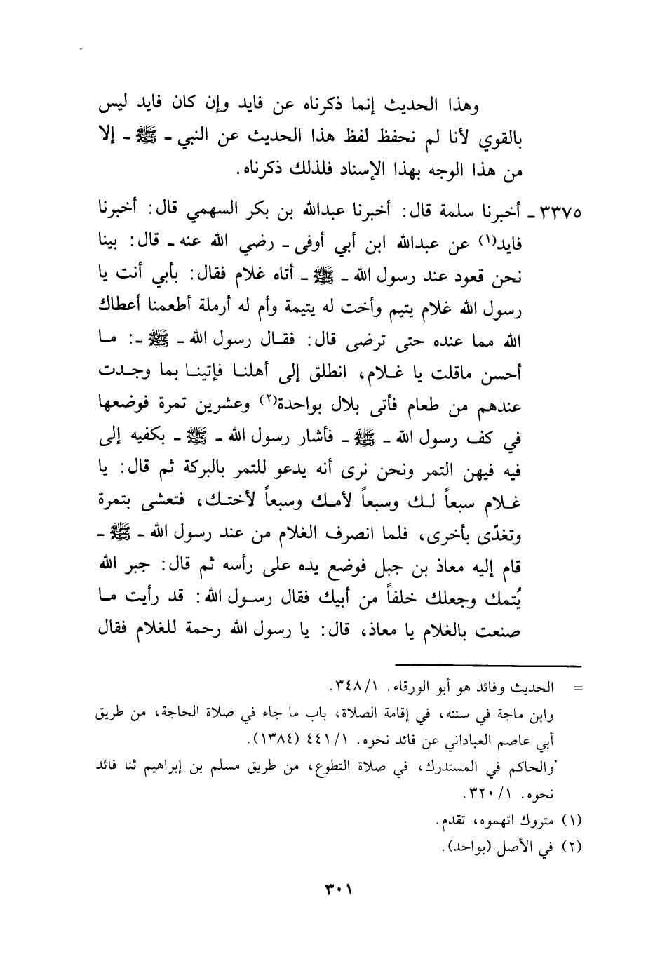 3375 - أَخْبَرَنَا سَلَمَةُ، قَالَ: أَخْبَرَنَا عَبْدُ اللَّهِ بْنُ بَكْرٍ السَّهْمِيُّ، قَالَ: أَخْبَرَنَا فَايِدٌ، عَنْ عَبْدِ اللَّهِ بْنِ أَبِي أَوْفَى رَضِيَ اللَّهُ عَنْهُ قَالَ: بَيْنَا نَحْنُ قُعُودٌ عِنْدَ رَسُولِ اللَّهِ صَلَّى اللهُ عَلَيْهِ وَسَلَّمَ، أَتَاهُ غُلَامٌ فَقَالَ: بِأَبِي أَنْتَ يَا رَسُولَ اللَّهِ، غُلَامٌ يَتِيمٌ وَأُخْتٌ لَهُ يَتِيمَةٌ وَأُمٌّ لَهُ أَرْمَلَةٌ، أَطْعِمْنَا أَعْطَاكَ اللَّهُ مِمَّا عِنْدَهُ حَتَّى تَرْضَى، قَالَ: فَقَالَ رَسُولُ اللَّهِ صَلَّى اللهُ عَلَيْهِ وَسَلَّمَ: «مَا أَحْسَنَ مَا قُلْتَ يَا غُلَامُ، انْطَلِقْ إِلَى أَهْلِنَا فَأْتِنَا بِمَا وَجَدْتَ عِنْدَهُمْ مِنْ طَعَامٍ» ، فَأَتَى بِلَالٌ بِوَاحِدَةٍ وَعِشْرِينَ تَمْرَةً، فَوَضَعَهَا فِي كَفِّ رَسُولِ اللَّهِ صَلَّى اللهُ عَلَيْهِ وَسَلَّمَ، فَأَشَارَ رَسُولُ اللَّهِ صَلَّى اللهُ عَلَيْهِ وَسَلَّمَ بِكَفَّيْهِ إِلَى فِيهِ فِيهِنَّ التَّمْرُ، وَنَحْنُ نَرَى أَنَّهُ يَدْعُو لِلتَّمْرِ بِالْبَرَكَةَ، ثُمَّ قَالَ: «يَا غُلَامُ سَبْعًا لَكَ، وَسَبْعًا لِأُمِّكَ وَسَبْعًا لِأُخْتِكَ، فَتَعَشَّى بِتَمْرَةٍ وَتَغَدَّى بِأُخْرَى» ، فَلَمَّا انْصَرَفَ الْغُلَامُ مِنْ عِنْدِ رَسُولِ اللَّهِ صَلَّى اللهُ عَلَيْهِ وَسَلَّمَ قَامَ إِلَيْهِ مُعَاذُ بْنُ جَبَلٍ، فَوَضَعَ يَدَهُ عَلَى رَأْسِهِ، ثُمَّ قَالَ: جَبَرَ اللَّهُ يُتْمَكَ وَجَعَلَكَ خَلَفًا مِنْ أَبِيكَ، فَقَالَ رَسُولُ اللَّهِ صَلَّى اللهُ عَلَيْهِ وَسَلَّمَ: «قَدْ رَأَيْتَ مَا صَنَعْتُ بِالْغُلَامِ يَا مُعَاذُ» ، قَالَ: يَا رَسُولَ اللَّهِ، رَحْمَةً لِلْغُلَامِ، فَقَالَ -[302]- رَسُولُ اللَّهِ صَلَّى اللهُ عَلَيْهِ وَسَلَّمَ عِنْدَ ذَلِكَ: «وَالَّذِي نَفْسُ مُحَمَّدٍ بِيَدِهِ، §لَا يَلِي أَحَدٌ مِنَ الْمُسْلِمِينَ يَتِيمًا فَيُحْسِنُ وِلَايَتَهُ، إِلَّا جَعَلَ اللَّهُ لَهُ بِكُلِّ شَعْرَةٍ دَرَجَةً، وَأَعْطَاهُ بِكُلِّ شَعْرَةٍ حَسَنَةً، وَكَفَّرَ عَنْهُ بِكُلِّ شَعْرَةٍ سَيِّئَةً» ، وَهَذَا الْحَدِيثُ لَا نَعْلَمُهُ يُرْوَى عَنِ النَّبِيِّ صَلَّى اللهُ عَلَيْهِ وَسَلَّمَ مِنْ وَجْهِ مِنَ الْوُجُوهِ إِلَّا مِنْ هَذَا الْوَجْهِ عَنِ ابْنِ أَبِي أَوْفَى وَقَدْ تَقَدَّمَ ذِكْرُنَا لِفَايِدٍ