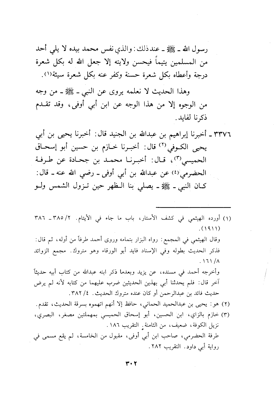 3376 - أَخْبَرَنَا إِبْرَاهِيمُ بْنُ عَبْدِ اللَّهِ بْنِ الْجُنَيْدِ، قَالَ: أَخْبَرَنَا يَحْيَى بْنُ أَبِي يَحْيَى الْكُوفِيُّ، قَالَ: أَخْبَرَنَا خَازِمُ بْنُ حُسَيْنٍ أَبُو إِسْحَاقَ الْحُمَيْسِيُّ، قَالَ: أَخْبَرَنَا مُحَمَّدُ بْنُ جُحَادَةَ، عَنْ طَرَفَةَ الْحَضْرَمِيِّ، عَنْ عَبْدِ اللَّهِ بْنِ أَبِي أَوْفَى رَضِيَ اللَّهُ عَنْهُ قَالَ: " كَانَ النَّبِيُّ صَلَّى اللهُ عَلَيْهِ وَسَلَّمَ §يُصَلِّي بِنَا الظُّهْرَ حِينَ تَزُولُ الشَّمْسُ، وَلَوْ -[303]- جُعِلَتْ حَبَّةٌ فِي الرَّمْضَاءِ لَأَنْضَجَتْهُ، ثُمَّ يُطِيلُ الرَّكْعَةَ الْأُولَى فَلَا يَزَالُ قَائِمًا يَقْرَأُ مَا سَمِعَ خَفْقَ نِعَالِ الْقَوْمِ، ثُمَّ يَرْكَعُ، ثُمَّ يَقُومُ فِي الثَّانِيَةِ فَيَرْكَعُ رَكْعَةً هِيَ أَقْصَرُ مِنَ الرَّكْعَةِ الْأُولَى، ثُمَّ يَجْعَلُ الرَّكْعَةَ الثَّالِثَةَ أَقْصَرَ مِنَ الثَّانِيَةِ، وَالرَّابِعَةَ أَقْصَرَ مِنَ الثَّالِثَةِ، ثُمَّ يُصَلِّي الْعَصْرَ وَالشَّمْسُ بَيْضَاءَ نَقِيَّةً قَدْرَ مَا يَسِيرُ السَّائِرُ فَرْسَخَيْنِ أَوْ ثَلَاثَةً، وَيُطِيلُ الرَّكْعَةَ الْأُولَى مِنَ الْعَصْرِ، وَيَجْعَلُ الثَّانِيَةَ أَقْصَرُ مِنَ الْأُولَى، وَيُصَلِّي الْمَغْرِبَ حِينَ يَقُولُ الْقَائِلُ: غَرَبَتِ الشَّمْسُ أَمْ لَا؟، وَيُطِيلُ الرَّكْعَةَ الْأُولَى مِنَ الْمَغْرِبِ، وَيَجْعَلُ الرَّكْعَةَ الثَّانِيَةَ أَقْصَرَ مِنَ الْأُولَى، وَالثَّالِثَةَ أَقْصَرَ مِنَ الثَّانِيَةِ، وَيُؤَخِّرُ صَلَاةَ الْعِشَاءِ الْآخِرَةِ شَيْئًا "، وَهَذَا الْحَدِيثُ لَا نَعْلَمُهُ يُرْوَى عَنِ ابْنِ أَبِي أَوْفَى إِلَّا مِنْ هَذَا الْوَجْهِ بِهَذَا الْإِسْنَادِ