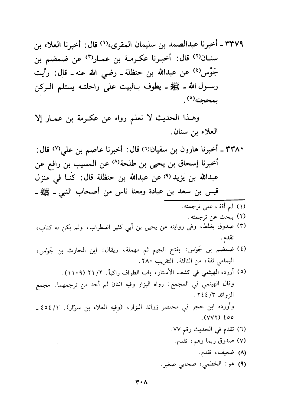 3379 - أَخْبَرَنَا عَبْدُ الصَّمَدِ بْنُ سُلَيْمَانَ الْمُقْرِئُ، قَالَ: أَخْبَرَنَا الْعَلَاءُ بْنُ سِنَانٍ، قَالَ: أَخْبَرَنَا عِكْرِمَةُ بْنُ عَمَّارٍ، عَنْ ضَمْضَمِ بْنِ جَوْسِ، عَنْ عَبْدِ اللَّهِ بْنِ حَنْظَلَةَ رَضِيَ اللَّهُ عَنْهُ قَالَ: «رَأَيْتُ رَسُولَ اللَّهِ صَلَّى اللهُ عَلَيْهِ وَسَلَّمَ §يَطُوفُ بِالْبَيْتِ عَلَى رَاحِلَتِهِ، يَسْتَلِمُ الرُّكْنَ بِمِحْجَنِهِ» ، وَهَذَا الْحَدِيثُ لَا نَعْلَمُ رَوَاهُ عَنْ عِكْرِمَةَ بْنِ عَمَّارٍ إِلَّا الْعَلَاءُ بْنُ سِنَانٍ