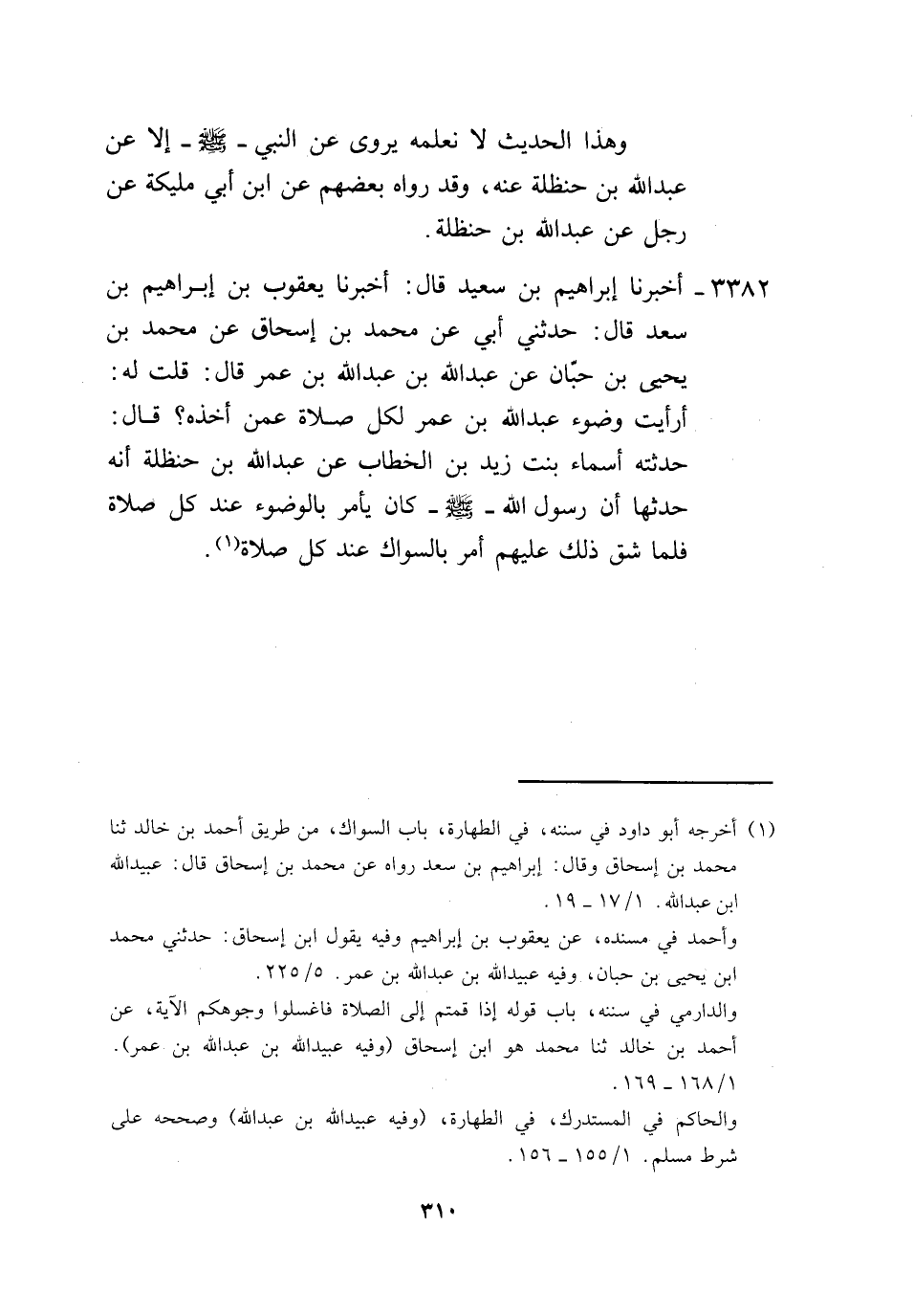 3382 - أَخْبَرَنَا إِبْرَاهِيمُ بْنُ سَعِيدٍ، قَالَ: أَخْبَرَنَا يَعْقُوبُ بْنُ إِبْرَاهِيمَ بْنِ سَعْدٍ، قَالَ: حَدَّثَنِي أَبِي، عَنْ مُحَمَّدِ بْنِ إِسْحَاقَ، عَنْ مُحَمَّدِ بْنِ يَحْيَى بْنِ حَبَّانَ، عَنْ عَبْدِ اللَّهِ بْنِ عَبْدِ اللَّهِ بْنِ عُمَرَ، قَالَ: قُلْتُ لَهُ: أَرَأَيْتَ وُضُوءَ عَبْدِ اللَّهِ بْنِ عُمَرَ لِكُلِّ صَلَاةٍ عَمَّنْ أَخَذَهُ؟ قَالَ: حَدَّثَتْهُ أَسْمَاءُ بِنْتُ زَيْدِ بْنِ الْخَطَّابِ عَنْ عَبْدِ اللَّهِ بْنِ حَنْظَلَةَ أَنَّهُ حَدَّثَهَا أَنَّ رَسُولَ اللَّهِ صَلَّى اللهُ عَلَيْهِ وَسَلَّمَ كَانَ §يَأْمُرُ بِالْوُضُوءِ عِنْدَ كُلِّ صَلَاةٍ، فَلَمَّا شَقَّ ذَلِكَ عَلَيْهِمْ أَمَرَ بِالسِّوَاكِ عِنْدَ كُلِّ صَلَاةٍ