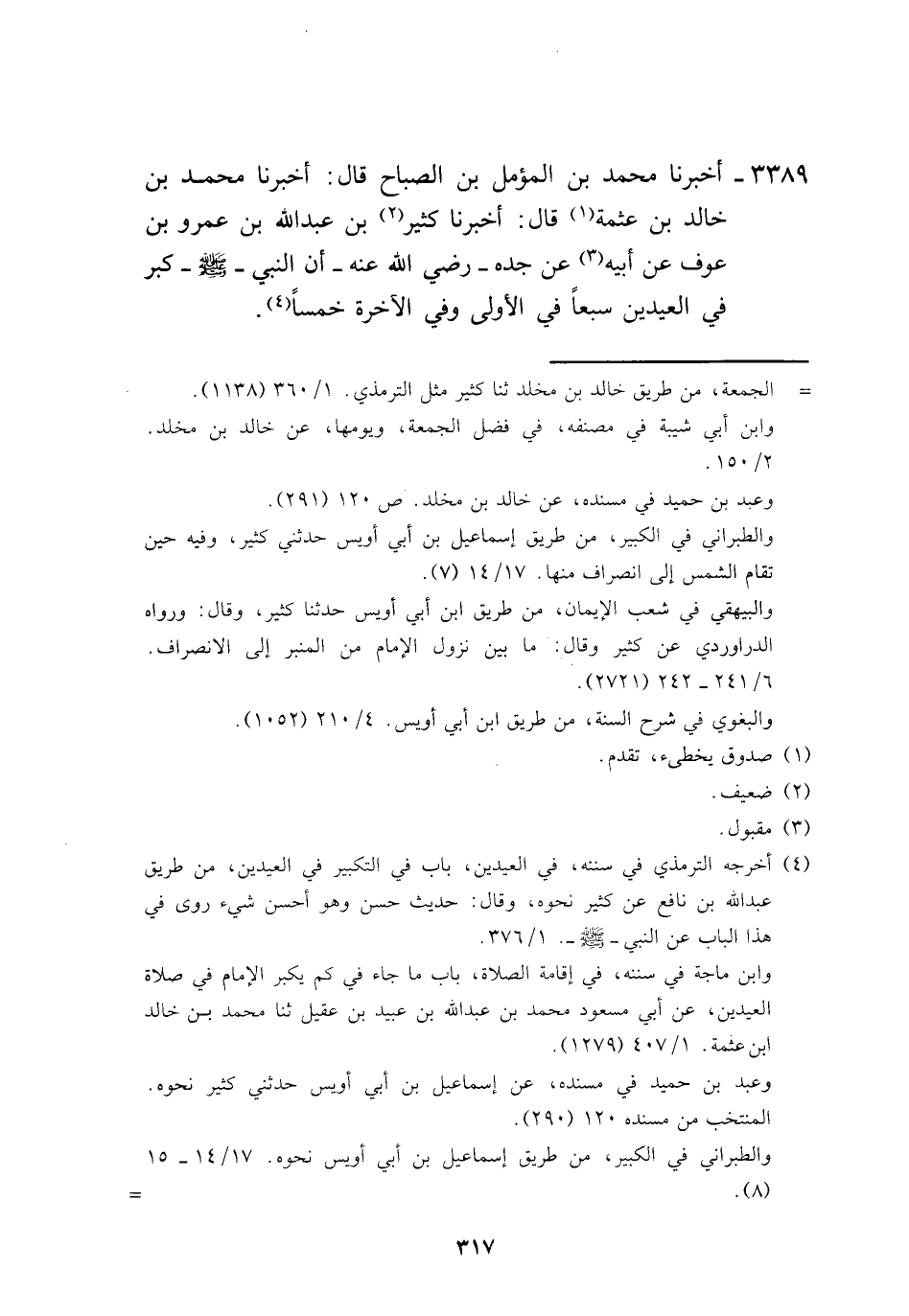 3389 - أَخْبَرَنَا مُحَمَّدُ بْنُ الْمُؤَمَّلِ بْنِ الصَّبَّاحِ، قَالَ: أَخْبَرَنَا مُحَمَّدُ بْنُ خَالِدِ بْنِ عَثْمَةَ، قَالَ: أَخْبَرَنَا كَثِيرُ بْنُ عَبْدِ اللَّهِ بْنِ عَمْرِو بْنِ عَوْفٍ، عَنْ أَبِيهِ، عَنْ جَدِّهِ رَضِيَ اللَّهُ عَنْهُ «أَنَّ النَّبِيَّ صَلَّى اللهُ عَلَيْهِ وَسَلَّمَ §كَبَّرَ فِي الْعِيدَيْنِ سَبْعًا، فِي الْأُولَى وَفِي الْآخِرَةِ خَمْسًا»