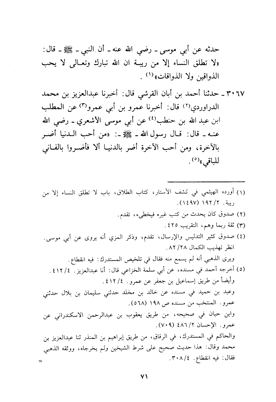 3067 - حَدَّثَنَا أَحْمَدُ بْنُ أَبَانَ الْقُرَشِيُّ، قَالَ: أَخْبَرَنَا عَبْدُ الْعَزِيزِ بْنُ مُحَمَّدٍ الدَّرَاوَرْدِيُّ، قَالَ: أَخْبَرَنَا عَمْرُو بْنُ أَبِي عَمْرٍو، عَنِ الْمُطَّلِبِ بْنِ عَبْدِ اللَّهِ بْنِ حَنْطَبٍ، عَنْ أَبِي مُوسَى الْأَشْعَرِيِّ رَضِيَ اللَّهُ، عَنْهُ قَالَ: قَالَ رَسُولُ اللَّهِ صَلَّى اللهُ عَلَيْهِ وَسَلَّمَ: «§مَنْ أَحَبَّ الدُّنْيَا أَضَرَّ بِالْآخِرَةِ، وَمَنْ أَحَبَّ الْآخِرَةَ أَضَرَّ بِالدُّنْيَا أَلَا فَأَضِرُّوا بِالْفَانِي لِلْبَاقِي»