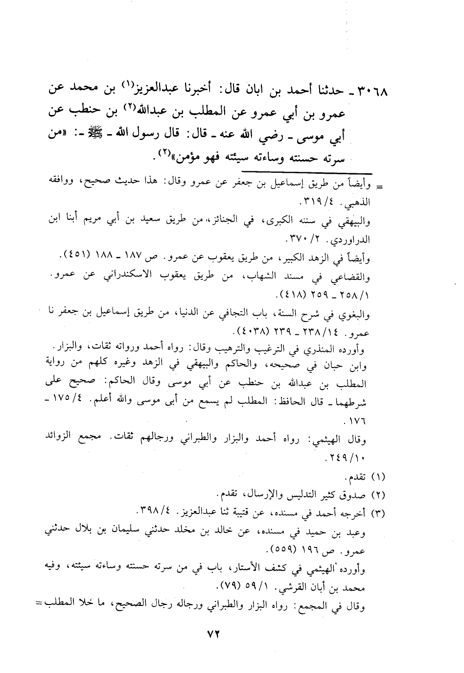 3068 - حَدَّثَنَا أَحْمَدُ بْنُ أَبَانَ، قَالَ: أَخْبَرَنَا عَبْدُ الْعَزِيزِ بْنُ مُحَمَّدٍ، عَنْ عَمْرِو بْنِ أَبِي عَمْرٍو، عَنِ الْمُطَّلِبِ بْنِ عَبْدِ اللَّهِ بْنِ حَنْطَبٍ، عَنْ أَبِي مُوسَى، رَضِيَ اللَّهُ عَنْهُ قَالَ: قَالَ رَسُولُ اللَّهِ صَلَّى اللهُ عَلَيْهِ وَسَلَّمَ: «§مَنْ سَرَّتْهُ حَسَنَتُهُ وَسَاءَتْهُ سَيِّئَتُهُ فَهُوَ مُؤْمِنٌ» -[73]- وَهَاذَانِ الْحَدِيثَانِ لَا نَعْلَمُهُمَا يُرْوَيَانِ عَنْ أَبِي مُوسَى إِلَّا بِهَذَا الْإِسْنَادِ