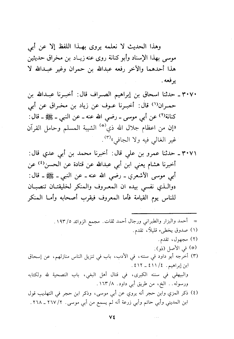 3070 - حَدَّثَنَا إِسْحَاقُ بْنُ إِبْرَاهِيمَ الصَّوَّافُ، قَالَ: أَخْبَرَنَا عَبْدُ اللَّهِ بْنُ حُمْرَانَ، قَالَ: أَخْبَرَنَا عَوْفٌ، عَنْ زِيَادِ بْنِ مِخْرَاقٍ، عَنْ أَبِي كِنَانَةَ، عَنْ أَبِي مُوسَى، رَضِيَ اللَّهُ عَنْهُ عَنِ النَّبِيِّ صَلَّى اللهُ عَلَيْهِ وَسَلَّمَ قَالَ: «إِنَّ §مِنْ إِعْظَامِ جَلَالِ اللَّهِ ذِي الشَّيْبَةِ الْمُسْلِمِ، وَحَامِلِ الْقُرْآنِ غَيْرِ الْغَالِي فِيهِ وَلَا الْجَافِي»