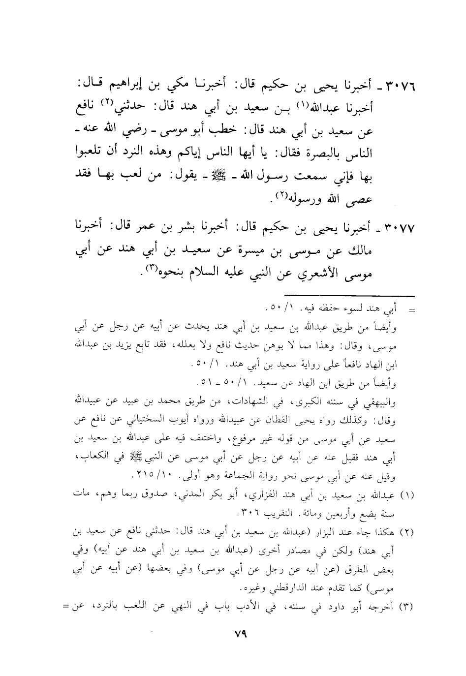 3076 - أَخْبَرَنَا يَحْيَى بْنُ حَكِيمٍ، قَالَ: أَخْبَرَنَا مَكِّيُّ بْنُ إِبْرَاهِيمَ، قَالَ: أَخْبَرَنَا عَبْدُ اللَّهِ بْنُ سَعِيدِ بْنِ أَبِي هِنْدٍ، قَالَ: حَدَّثَنِي نَافِعٌ، عَنْ سَعِيدِ بْنِ أَبِي هِنْدٍ، قَالَ: خَطَبَ أَبُو مُوسَى رَضِيَ اللَّهُ عَنْهُ النَّاسَ بِالْبَصْرَةِ، فَقَالَ: يَا أَيُّهَا النَّاسُ، إِيَّاكُمْ وَهَذِهِ النَّرْدِ أَنْ تَلْعَبُوا بِهَا، فَإِنِّي سَمِعْتُ رَسُولَ اللَّهِ صَلَّى اللهُ عَلَيْهِ وَسَلَّمَ يَقُولُ: «§مَنْ لَعِبَ بِهَا فَقَدْ عَصَى اللَّهَ وَرَسُولَهُ» ،