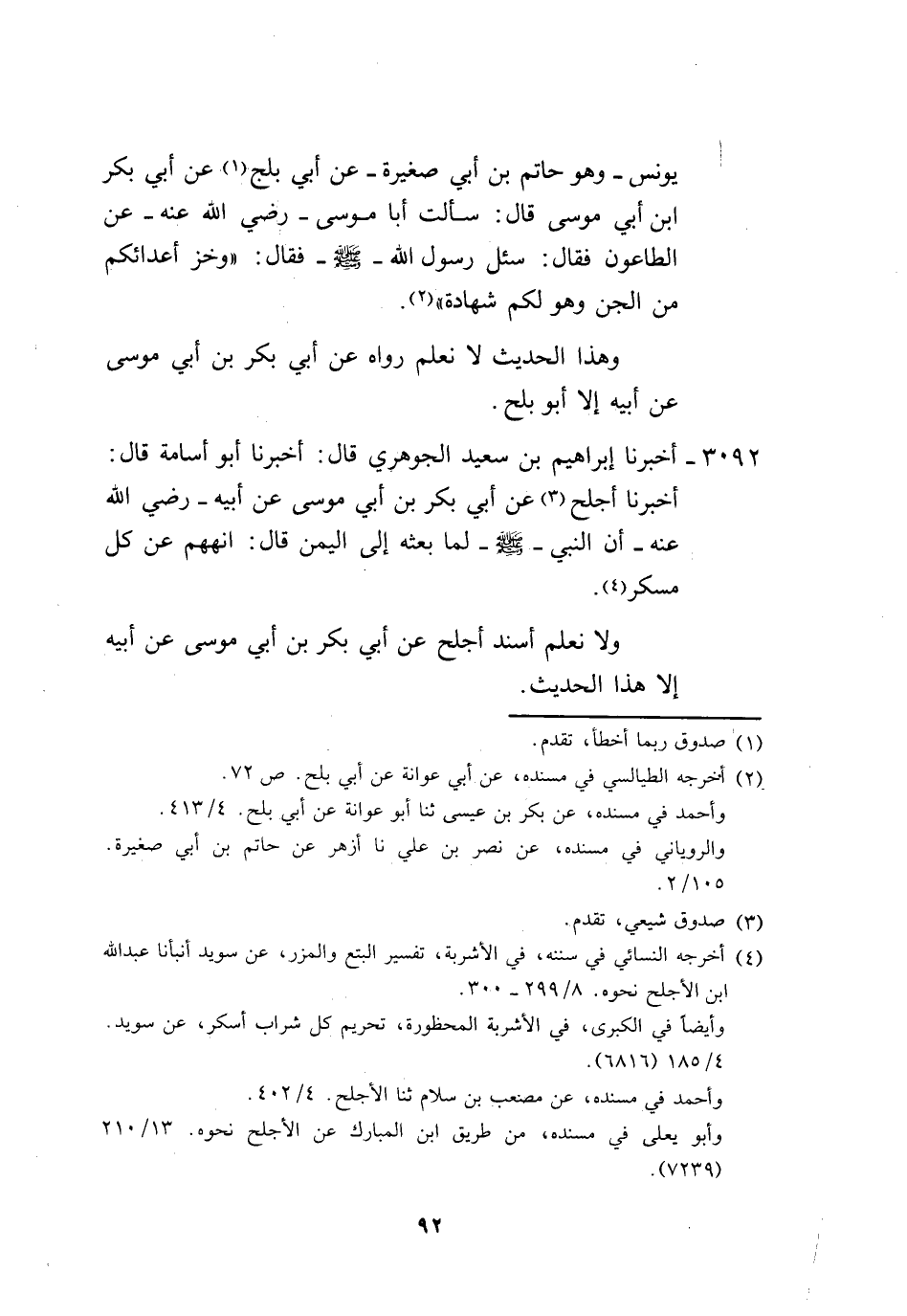 3092 - أَخْبَرَنَا إِبْرَاهِيمُ بْنُ سَعِيدٍ الْجَوْهَرِيُّ، قَالَ: أَخْبَرَنَا أَبُو أُسَامَةَ، قَالَ: أَخْبَرَنَا أَجْلَحُ، عَنْ أَبِي بَكْرِ بْنِ أَبِي مُوسَى، عَنْ أَبِيهٍ رَضِيَ اللَّهُ عَنْهُ، أَنَّ النَّبِيَّ صَلَّى اللهُ عَلَيْهِ وَسَلَّمَ لَمَّا بَعَثَهُ إِلَى الْيَمَنِ، قَالَ: «§انهَهُمْ عَنْ كُلِّ مُسْكِرٍ» ، وَلَا نَعْلَمُ أَسْنَدُ أَجْلَحَ عَنْ أَبِي بَكْرِ بْنِ أَبِي مُوسَى عَنْ أَبِيهِ إِلَّا هَذَا الْحَدِيثَ