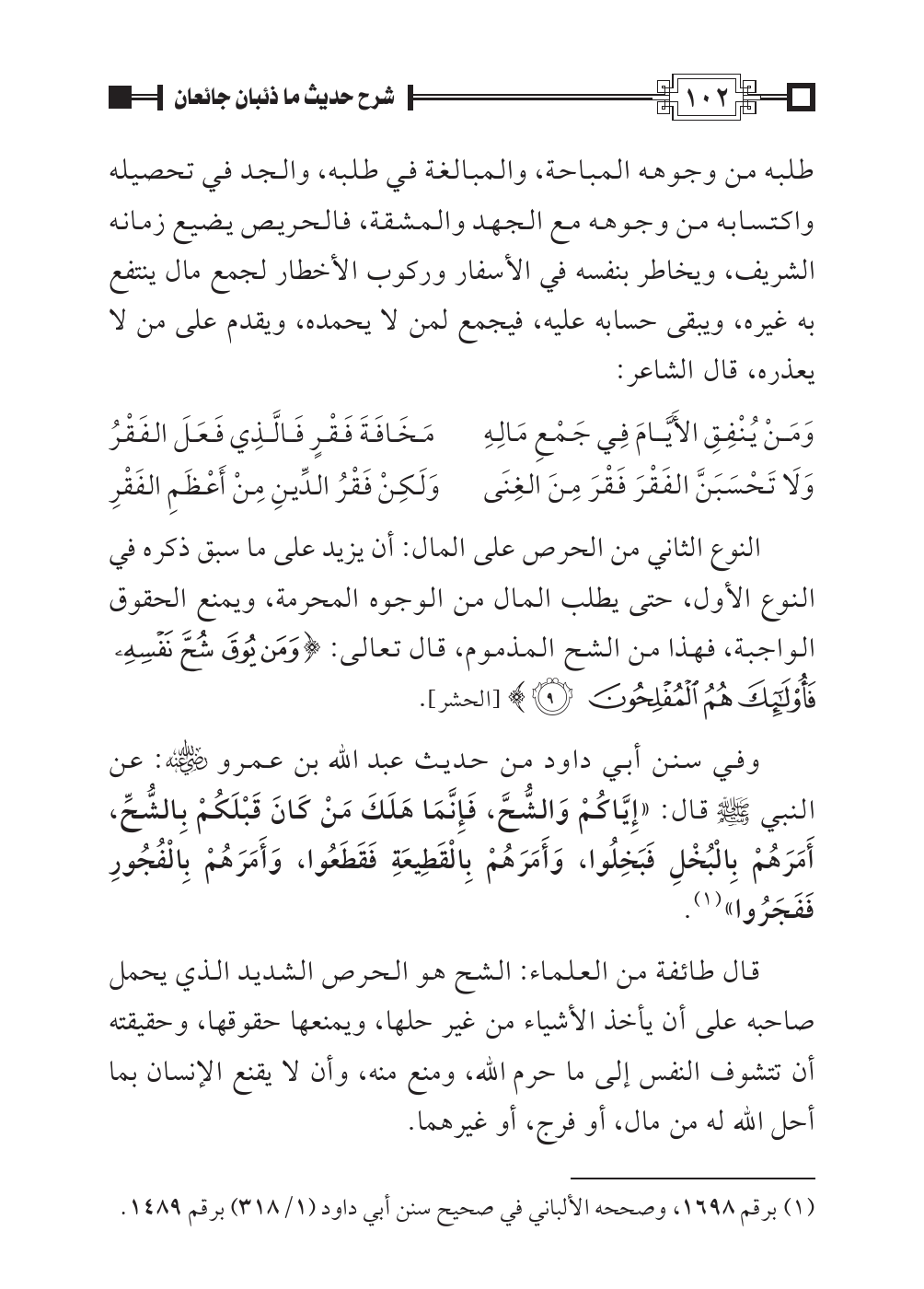 النوع الثاني من الحرص على المال: أن يزيد على ما سبق ذكره في النوع الأول، حتى يطلب المال من الوجوه المحرمة، ويمنع الحقوق الواجبة، فهذا من الشح المذموم، قال تعالى: {وَمَن يُوقَ شُحَّ نَفْسِهِ فَأُوْلَئِكَ هُمُ الْمُفْلِحُون} [الحشر: ٩].