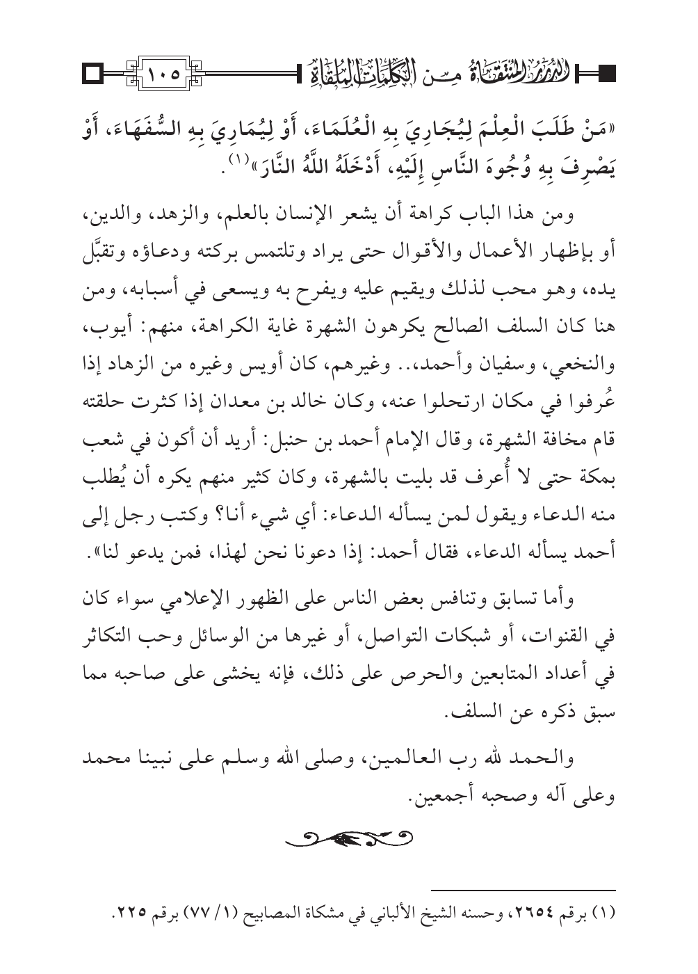 «مَنْ طَلَبَ الْعِلْمَ لِيُجَارِيَ بِهِ الْعُلَمَاءَ، أَوْ لِيُمَارِيَ بِهِ السُّفَهَاءَ، أَوْ يَصْرِفَ بِهِ وُجُوهَ النَّاسِ إِلَيْهِ، أَدْخَلَهُ اللَّهُ النَّارَ» (¬١).