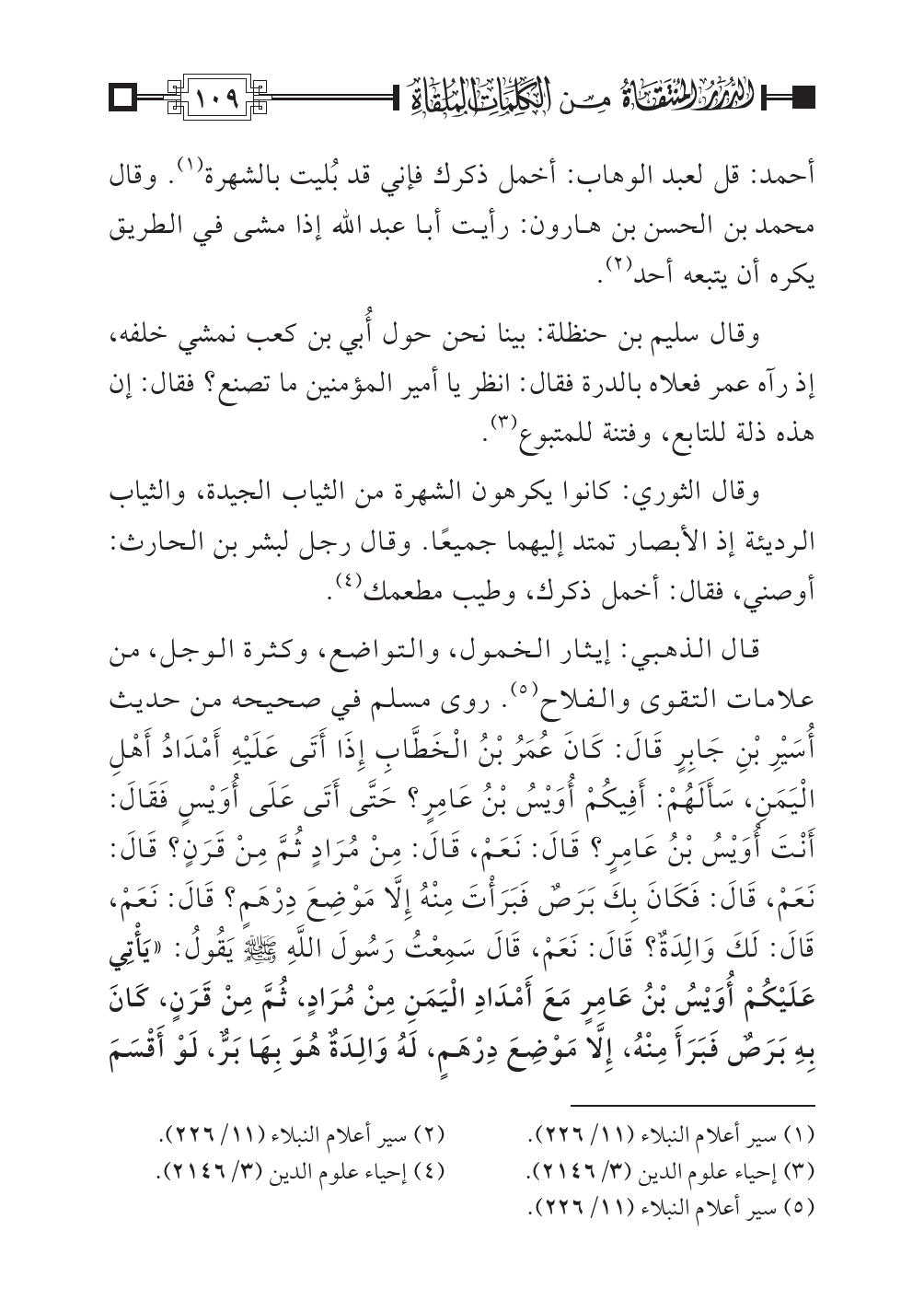 قال الذهبي: إيثار الخمول، والتواضع، وكثرة الوجل، من علامات التقوى والفلاح (¬٥). روى مسلم في صحيحه من حديث أُسَيْرِ بْنِ جَابِرٍ قَالَ: كَانَ عُمَرُ بْنُ الْخَطَّابِ إِذَا أَتَى عَلَيْهِ أَمْدَادُ أَهْلِ الْيَمَنِ، سَأَلَهُمْ: أَفِيكُمْ أُوَيْسُ بْنُ عَامِرٍ؟ حَتَّى أَتَى عَلَى أُوَيْسٍ فَقَالَ: أَنْتَ أُوَيْسُ بْنُ عَامِرٍ؟ قَالَ: نَعَمْ، قَالَ: مِنْ مُرَادٍ ثُمَّ مِنْ قَرَنٍ؟ قَالَ: نَعَمْ، قَالَ: فَكَانَ بِكَ بَرَصٌ فَبَرَاتَ مِنْهُ إِلَّا مَوْضِعَ دِرْهَمٍ؟ قَالَ: نَعَمْ، قَالَ: لَكَ وَالِدَةٌ؟ قَالَ: نَعَمْ، قَالَ سَمِعْتُ رَسُولَ اللَّهِ صلى الله عليه وسلم يَقُولُ: «يَاتِي عَلَيْكُمْ أُوَيْسُ بْنُ عَامِرٍ مَعَ أَمْدَادِ الْيَمَنِ مِنْ مُرَادٍ، ثُمَّ مِنْ قَرَنٍ، كَانَ بِهِ بَرَصٌ فَبَرَأَ مِنْهُ، إِلَّا مَوْضِعَ دِرْهَمٍ، لَهُ وَالِدَةٌ هُوَ بِهَا بَرٌّ، لَوْ أَقْسَمَ